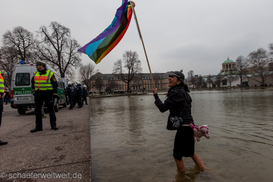 Erfreulicherweise wurden auch überraschende Zeichen gesetzt. Das Staatstheater Stuttgart zeigte der Schlusskundgebung endlich seine Meinung zu dieser Demonstration indem ein riesiges Banner am Opernhaus entfaltet wurde. Ebenso wurden direkt auf dem Marktplatz Regenbogenfahnen gehisst.