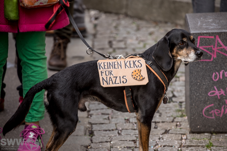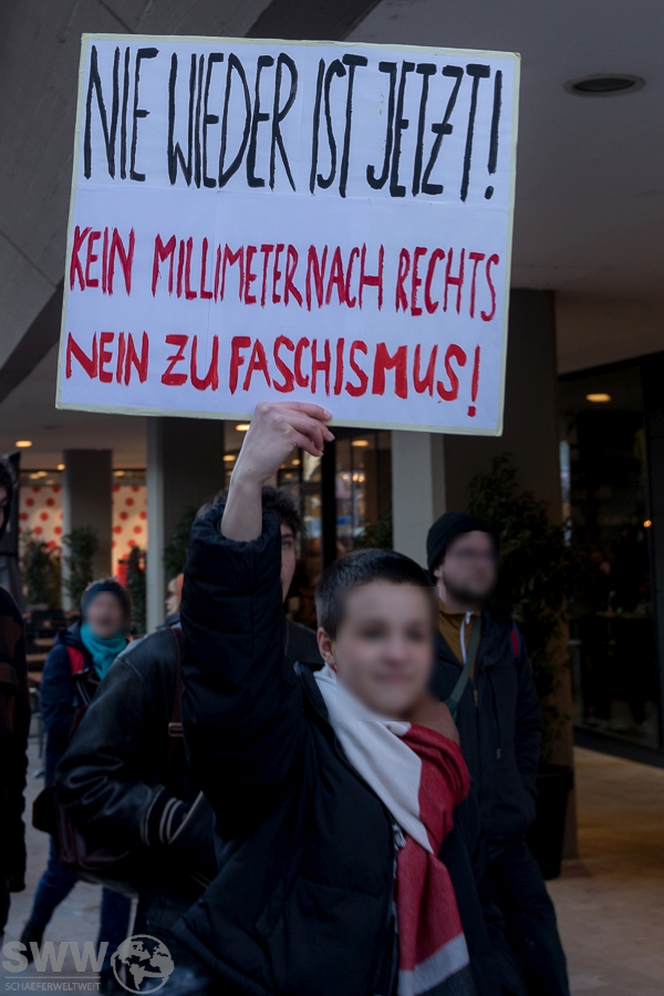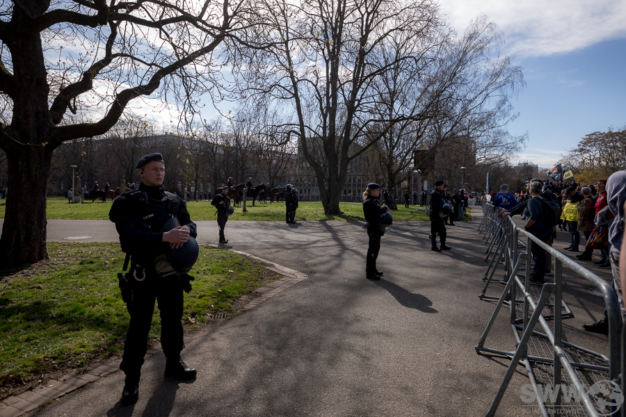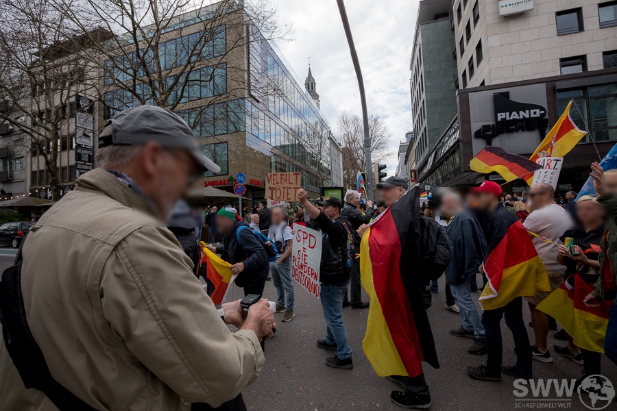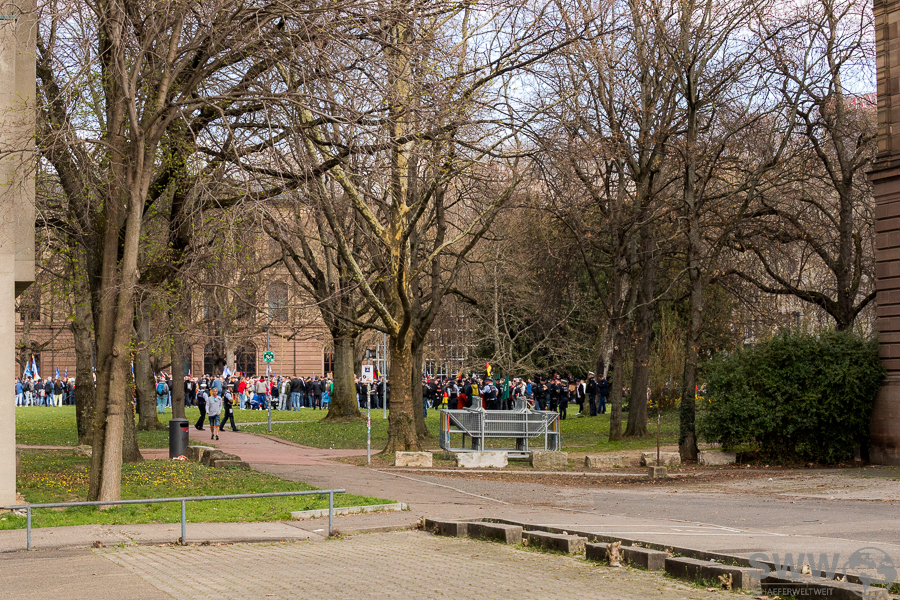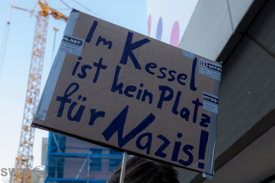 Nach nur 150 Metern auf dem Cityring musste die Polizei die Demo wieder zu ihrem Startplatz zurückleiten, da die Gegendemonstranten die Straße an mehreren Stellen bereits besetzt hatten. Während der rechten Auftaktveranstaltung hatten sich rund um den Stadtgarten zwischen 3.000 bis 4.000 Menschen gegen die Rechte Demo versammelt und sich später auf der Demostrecke verteilt. Insgesamt hatte die Demo also gerade mal 1,3 Kilometer auf Nebenstraßen und 150 Meter auf der Theodor-Heuss-Straße geschafft.