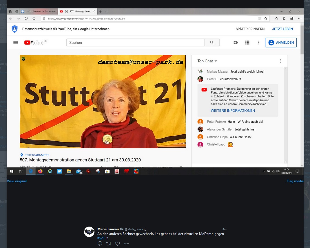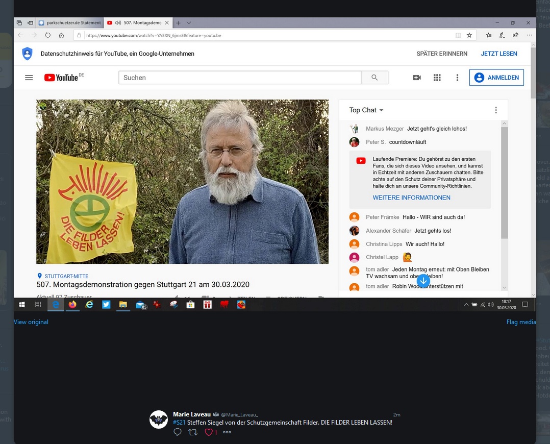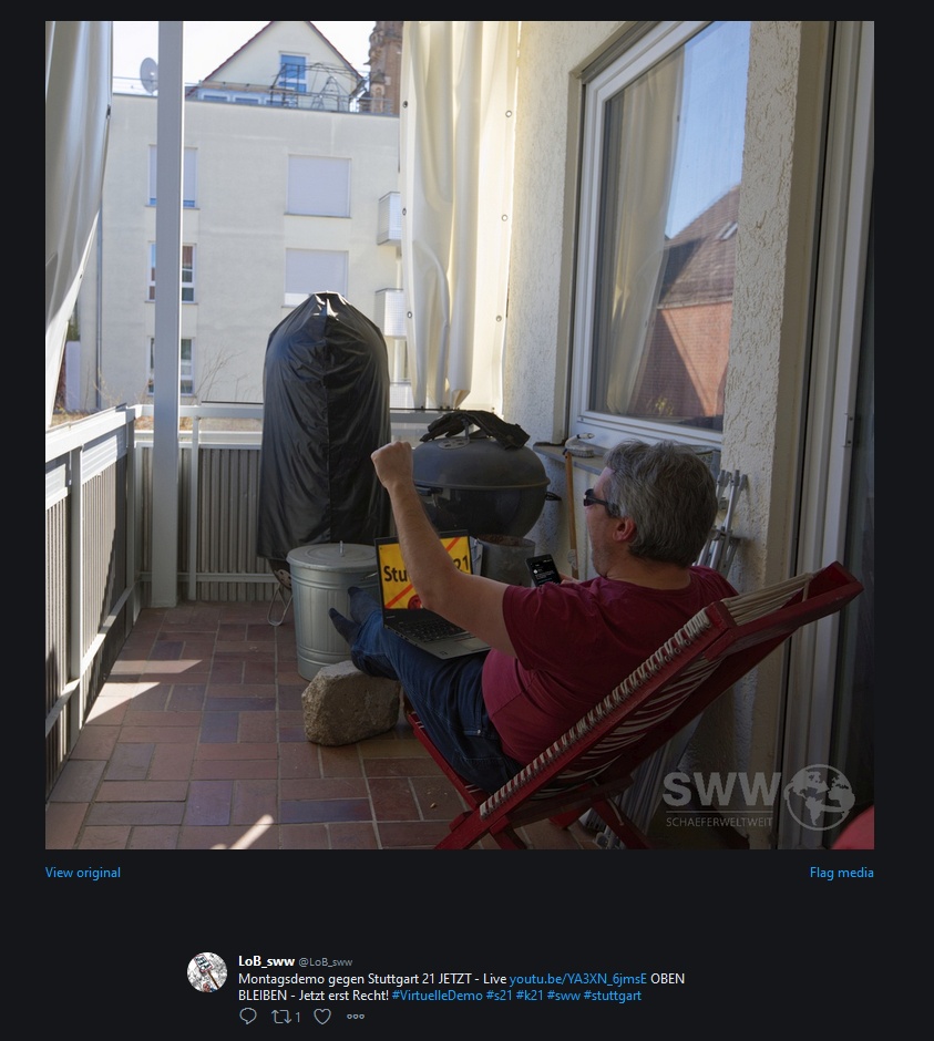 Ebenso sind alle Teilnehmer aufgerufen aktiv zu werden und nach den hier gezeigten Beispielen aus Twitter in ihren jeweiligen gewohnten Medien sei es Facebook, Twitter, Instagram, Whatsapp, Snapchat, tiktok, parkschuetzer.de oder was auch immer mit dem Youtube-Link, einen Hashtag #S21 und dem Demoplakat während der nächsten Demo zu zeigen was die Stuttgarter unter einer interaktiven virtuellen Demo verstehen! Die Demo bist DU mach mit, hilf mit, mach das beste draus! :o)