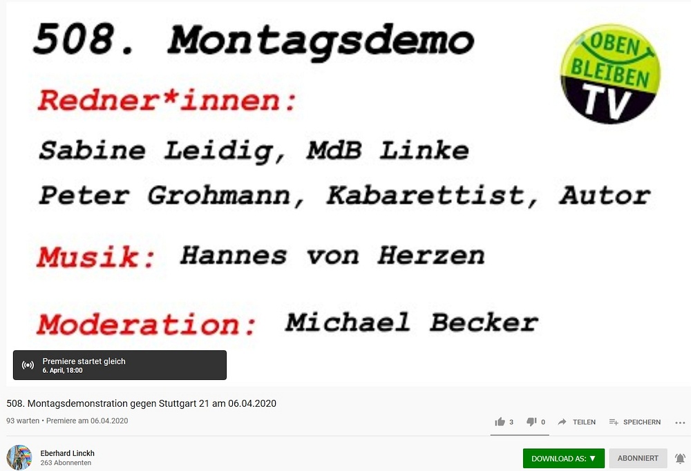 Die nächste Demonstration gegen Stuttgart 21 wird daher auch wieder am kommenden Montag um 18 Uhr im Internet stattfinden. Zur aktiven Unterstützung kann jeder helfen indem er/sie den Youtubekanal abonniert, was natürlich kostenlos ist und den Vorteil hat das man dann beim nächsten Video direkt eine Emailerinnerung bekommt. (falls man die Glocke aktiviert sonst wird es keine Mailinfo geben)