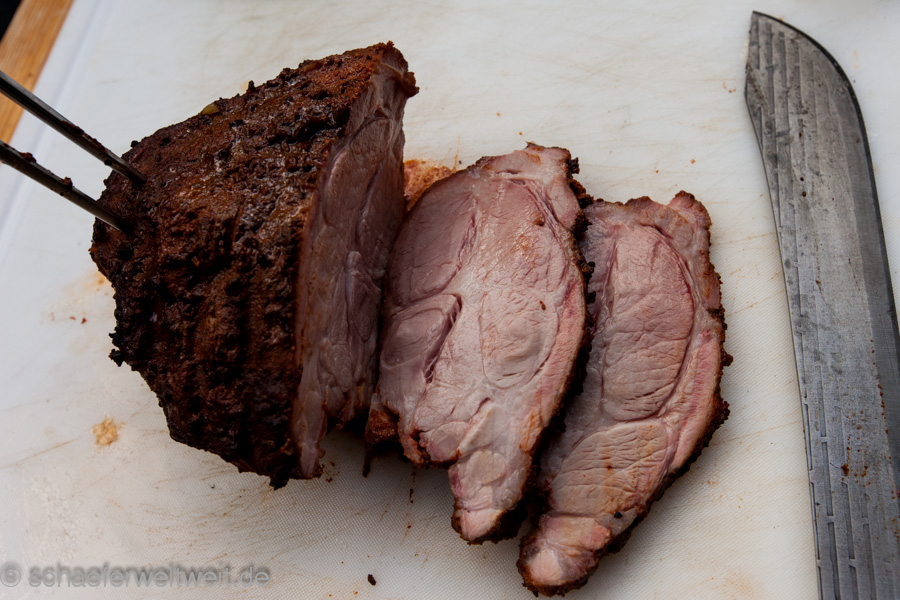 Vorteil ist hier zb. die verschiedenen größeren Löcher bzw. die Möglichkeit mehrere Löcher zu kombinieren. Auch andere Dinge die man nicht direkt auf dem Rost machen möchte kann man hier „einspannen“ (zb. Putenbruststücke etc.). Die Reinigung ist auch einfacher als bei vielen festen Modellen. Man kann die Bleche zum einweichen auseinander stecken und so mit einer geringen Wassermenge einweichen. Genauso ist es in Einzelteilen einfach möglich die Platten zu bürsten. Nicht zuletzt lassen sie sich dann auch Platzsparend lagern! Alles in allem ein interessantes System und zudem ist es auch möglich die Form genauso anzupassen wie hier in dem Fall die gelaserte Schrift schaeferweltweit.de! Bei interesse – einfach mal bei Timo Schill melden und nachfragen – auch andere Metallarbeiten sind hier umsetzbar (zb. auch ein Individueller Grillrost oder eine Sonderform für eine spezielle Anwendung oder einen Grilldurchmesser für den es keine Standard-Grillroste etc. gibt.).