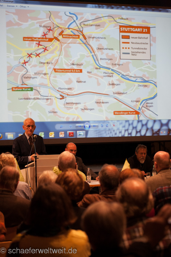 Das war der Titel der Veranstaltung am 14.11.12 in der Zehntscheuer in Echterdingen. Geladen hatte eine weitere sehr aktive Gruppe gegen S21 – die Schutzgemeinschaft Filder. Neben vielen anderen Ortgruppen rockt diese genauso das Thema wie viele andere! Spätestens als Steffen Siegel den Abend eröffnet und seine Gäste Egon Hopfenzitz (Bahnhofsleiter des Stuttgarter Hauptbahnhofs i.R.) und Frank Distel (Baubürgermeister Backnang i.R.) vorstellt, ist klar das dies eine hervorragende Veranstaltung werden wird.