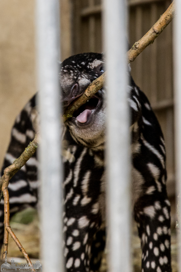 Hier sind einige Eindrücke aus dem Tapirhaus. Am 04.10.2024 erblickte ein kleiner Schabrakentapir das Licht der Welt, auf den Bildern hier ist das Alter also acht Tage. Wie sich inzwischen herausgestellt hat, handelt es sich um ein Weibchen, das die ersten Wochen ausschließlich im Innengehege und im nicht für die Öffentlichkeit zugänglichen Außengehege verbringen wird. So wird es dem Nachwuchs erleichtert, sich behutsam an diese neue, eindrucksvolle Umgebung zu gewöhnen.