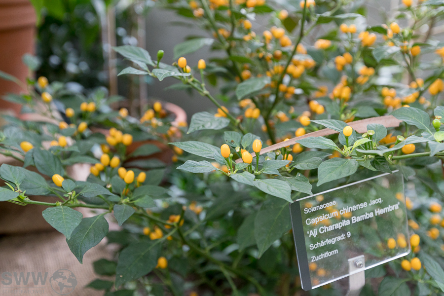 Neben diesem kleinen süßen Highlight bietet sich zurzeit auch die große Chilipflanzenausstellung mit ihren scharfen Highlights zur Besichtigung an. Hier stehen aktuell zahlreiche Sorten im reifen Fruchtzustand und zeigen in schillerndsten Farben die große Vielfalt dieser scharfen Beeren.