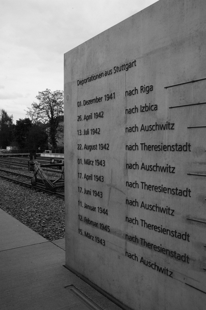 Insgesamt mehr als 2500 jüdische Mitbürger Stuttgarts wurden über das Durchgangslager auf dem Killesberg in die Sammel- und Konzentrationslager Riga, Izbica, Auschwitz, Buchenwald, ins Ghetto Theresienstadt und in ein Lager bei Wolfenbüttel deportiert. Die letzte Station in Stuttgart waren die Gleise am Nordbahnhofgelände.