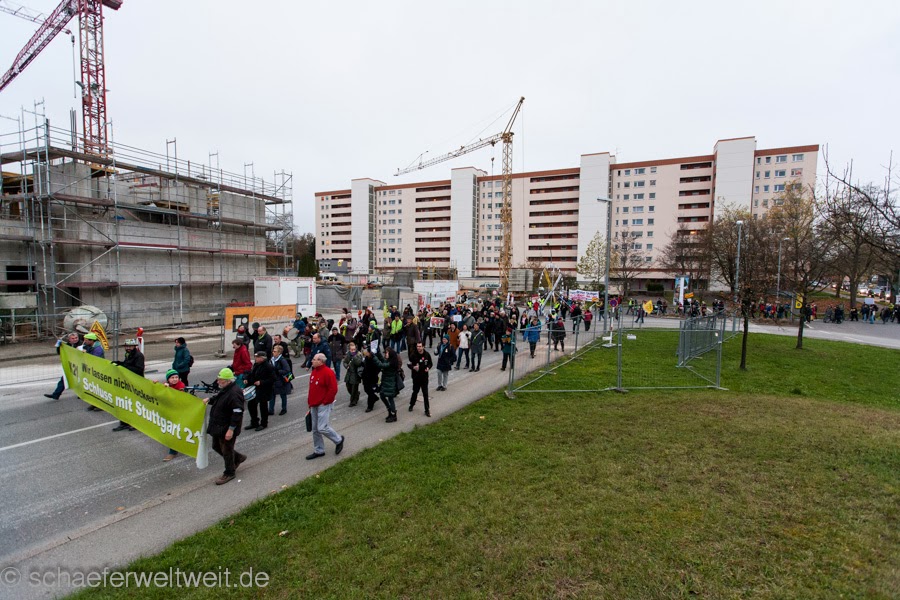 Um die Bevölkerung in der Nähe des von Stuttgart 21 Tunnelbauten betroffenen Gebietes Fasanenhof/Schelmenwasen zu informieren und aufzurütteln, demonstrierten Gegner des Immobilienprojektes am 16.11.13 im Stadtteil Fasanenhof. Die Demo startete und endete an der Haltestelle Europaplatz und führte unter anderem vorbei an der Stadtgärtnerei in welcher ein Teil der Bäume aus dem ehemaligen Mittleren Schlossgarten abgelegt und auch ein paar verpflanzt wurden. Impressionen der Demo: