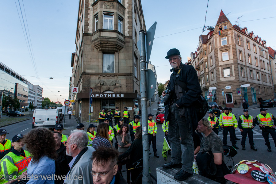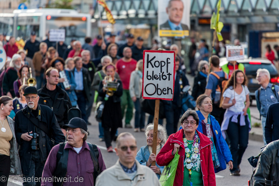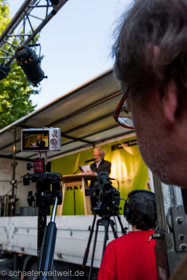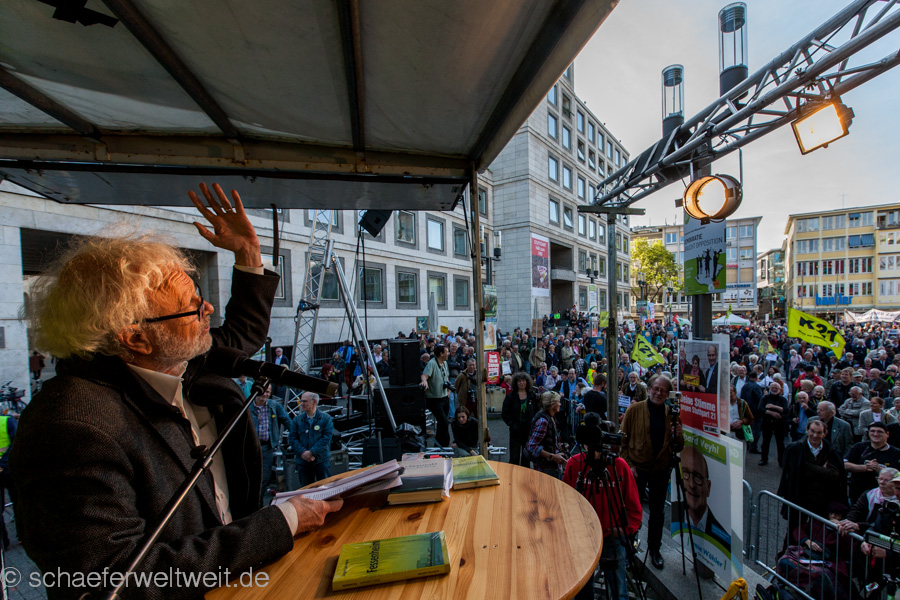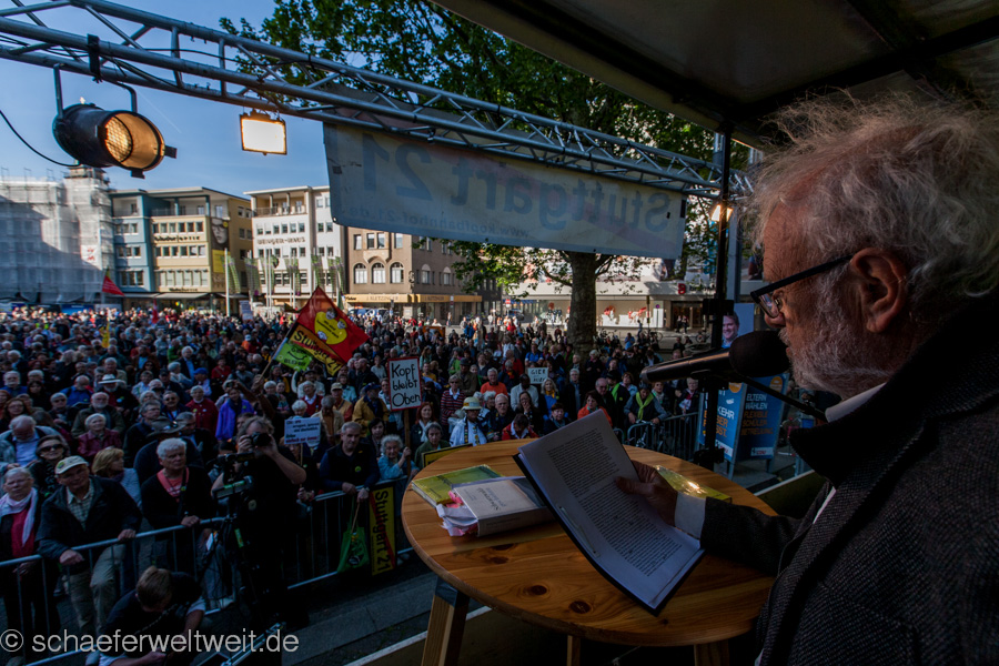Dr. Jürgen Lodemann, Schriftsteller („Anita Drögemöller“), Fernseh-Journalist, ehemaliger Leiter des legendären „SWF-Literaturmagazin“ und Träger u.a. des Stuttgarter Literatur-Preises, mit einer der interessantesten, jedenfalls aber der mit Abstand längsten je gehaltenen Montags-Demo-Rede gegen das Milliardenloch „Stuttgart 21“