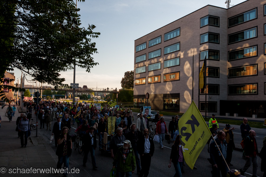 Anschließend ging es vor das EnBW-Kundenzentrum gegenüber dem Stuttgarter Hauptbahnhof. Auch hier demonstrierten die AKW-AktivistInnen mit Spruchbändern und einer Kundgebung. Sie verteilten Infos an die Passanten und machten auf die Gefahren der Atomkraft aufmerksam, erinnerten an die nicht wenigen Atom-Unfälle, wie z. B. Tschernobyl, Fukushima und andere, die eigentlich nur alle 10.000 Jahre passieren dürfen. Und da die AktivistInnen nun schon mal in Stuttgart waren, nahem sie auch an der 199. Montagsdemo teil.