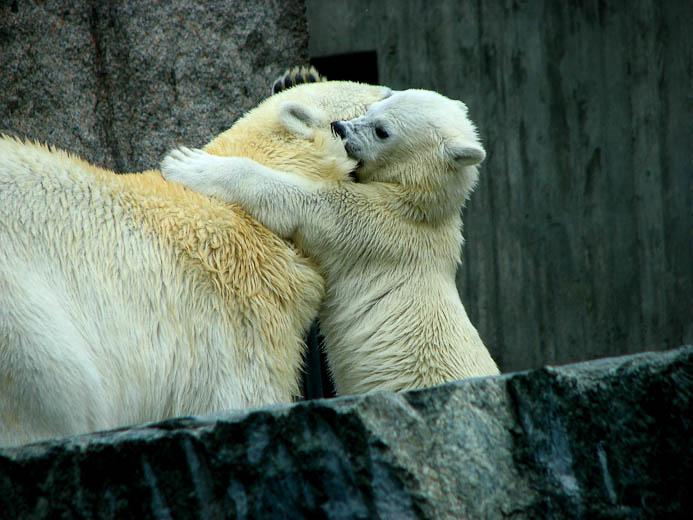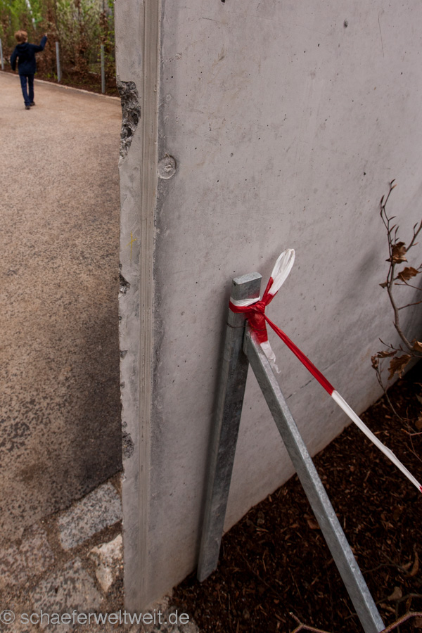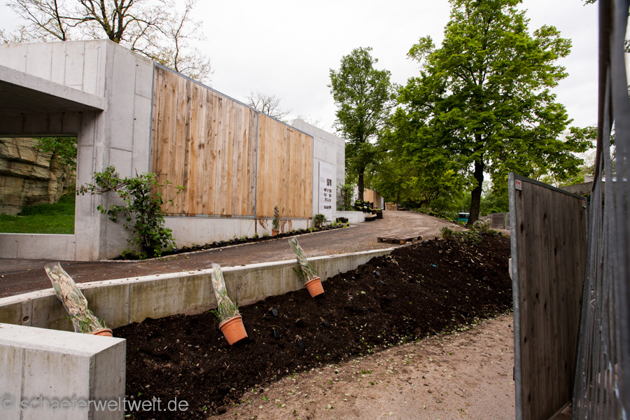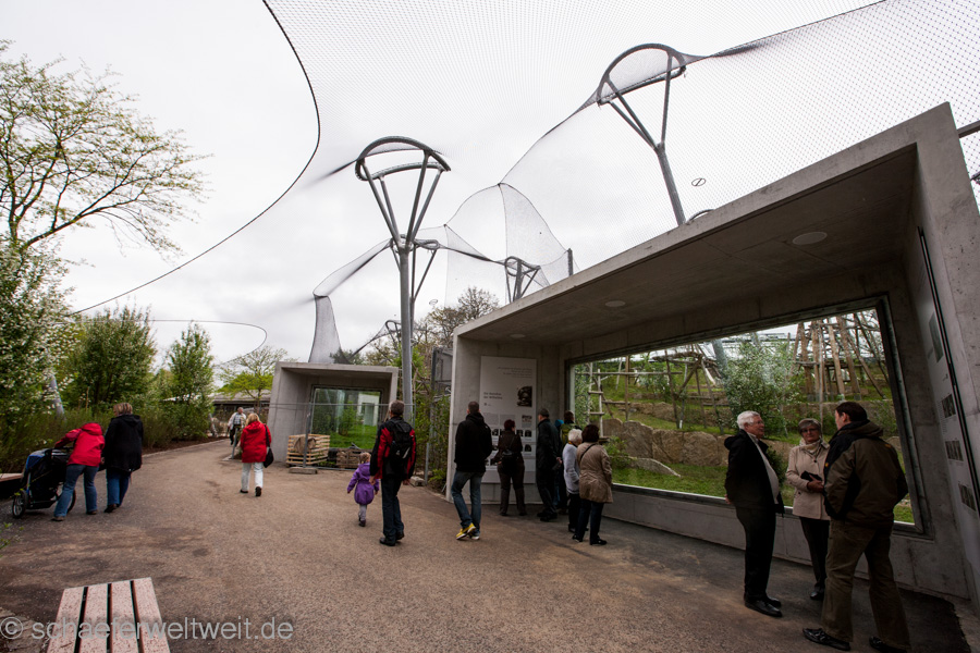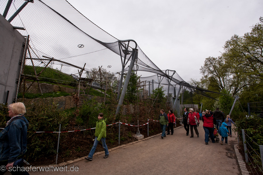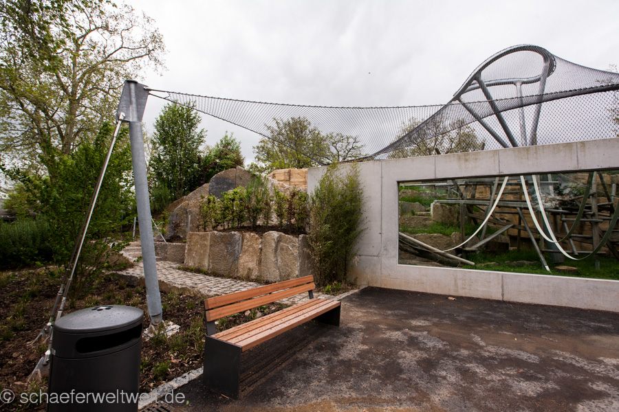 Gut die Tiere scheinen viel Platz und Bewegungsraum zu haben – auch im Aussenbereich welcher allerdings nicht nur für die Besucher noch nicht fertig ist sondern auch den Tieren noch nicht zur Verfügung steht. Im Aussenbereich fällt zuerst auf das der größte Teil noch lange nicht fertig zu sein scheint. Im Tierbereich zeigen herumliegende Leitern und im Besucherbereich etliche noch nicht bepflanzte Gebiete dies recht deutlich. Die Teile die man schon begehen darf begeistern zwar auf den Ersten Blick durch sehr umfangreiche Beschäftigungsmöglichkeiten für die Tiere, aber die meiner Ansicht nach unglaublich hässlichen Betoneinbauten in den ansonsten eigentlich sehr schöne Drahtseilkonstruktion haben mich schon sehr enttäuscht. Zudem zeigt der noch nicht mal dort fertiggestellte Zaun am Rand, fehlende Türen und jetzt schon abbröckelnde Beton nicht gerade das beste Bild einer Anlage welche gerade eben für die Mitglieder eröffneten Anlage.