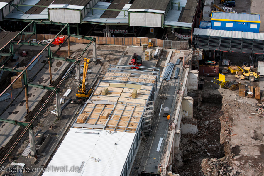 Auf der einen Seite wird das wohl nutzloseste Werbeplakat (weil man es nicht sehen konnte hinter Containern und Bauzäunen) der Welt abgebaut. Auf der anderen Seite wird ein Förderband eingebaut und die traurigen Reste des (immer noch) funktionierenden Kopfbahnhofes weiter zerstört. Impressionen im Jahr 2014 (immerhin mehr als 2 Jahre nach der sinnlosen Zerstörung des Mittleren Schlossgartens!) rund um den Kopfbahnhof in Stuttgart. (mehr Bilder)