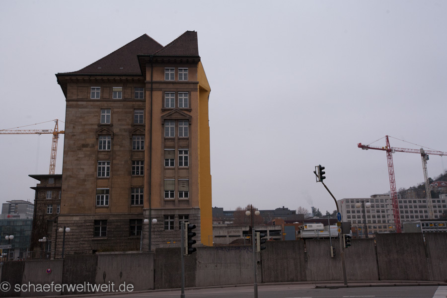 Wie man in diesem kurzen Video eindrucksvoll sehen kann, klafft direkt an den Gebäudefundamenten die tiefe Baugrube der U12 / Straßenbahn (SSB) Baustelle. Unter anderem sieht man hier auch, dass durch die Grundwasserabsenkung an dieser Stelle direkt unter dem Gebäude, der Grund massiv ausgetrocknet wird. Freilich ist noch lange nichts vom eigentlichen S21 Trogbau zu sehen, dieser soll ja dann letztlich das ganze Gebäude unterqueren. Was allerdings zu sehen ist sind bereits seit kurzem entstehende Gebäudeschäden in der angeblich zu erhaltenden Fassade!