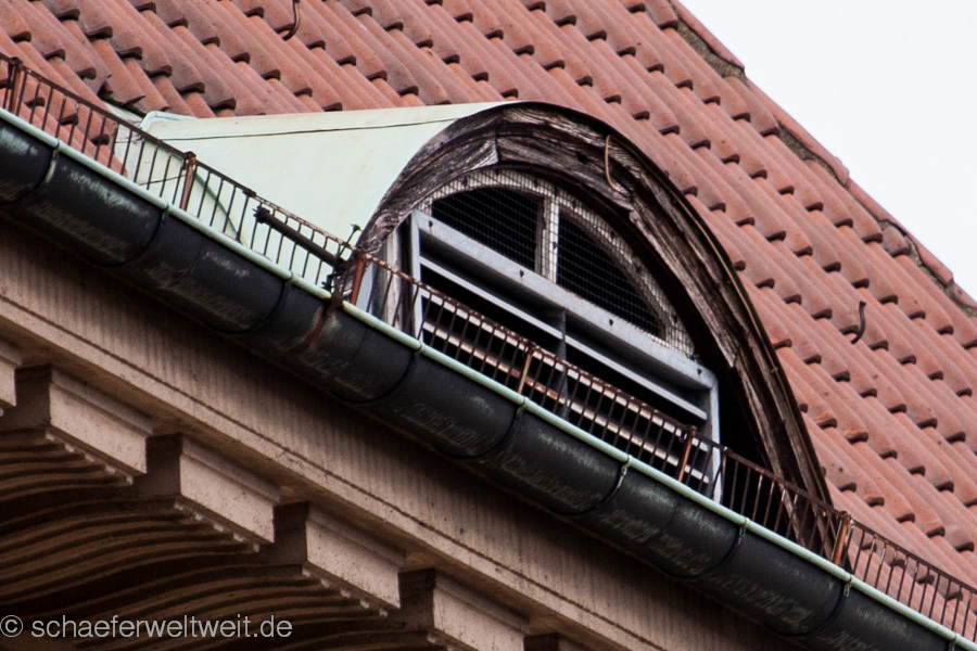 Der Riss im Gesims ist dem Anschein nach aber eine Arbeitsfuge o.ä, also nichts was zuerst auf Bewegungen im Untergrund hindeutet. Der Riss scheint so zuerst einmal ohne Bedeutung, ohne Feuchtigkeit auch unauffällig. Die Feuchtigkeit stammt entweder aus einer Wasserleitung, die im Dach verlegt und geplatzt oder dauerhaft nässend ist oder aber aus undichten Dachanschlüssen. Sie könnte auf kaputte Anschlüssen und Blechanschlüsse im Bereich der Darüber angeordneten Rundgaube hindeuten und aus schadhaften Anschlüssen stammen. Ohne die Untergrundbaustelle (U12) wäre das alles.