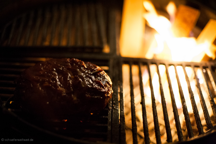 Bei Kerntemperatur im Fleisch 60°C mit BBQ Sauce einpinseln (am besten selbstgemacht aber zur Not auch gekauft – empfehle BullsEye Original) – Ich gab dem ganzen nun noch ein bisschen Power mit etwas Kirschholz (höhere Garraumtemperatur) bis KT 72 °C