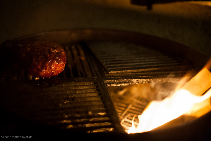 Eine gute handvoll geschnittene Jalapenos (Chili) aus eigener Ernte oder zur Not aus dem Glas – vermengen mit 300g Schweine- und 400g Rinderhack – Salz Pfeffer Chilipulver gehackte Zwiebel –