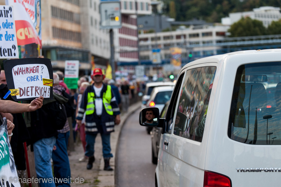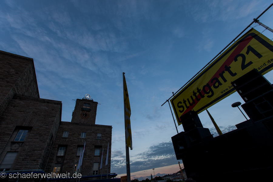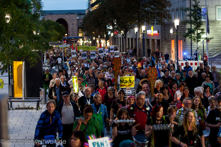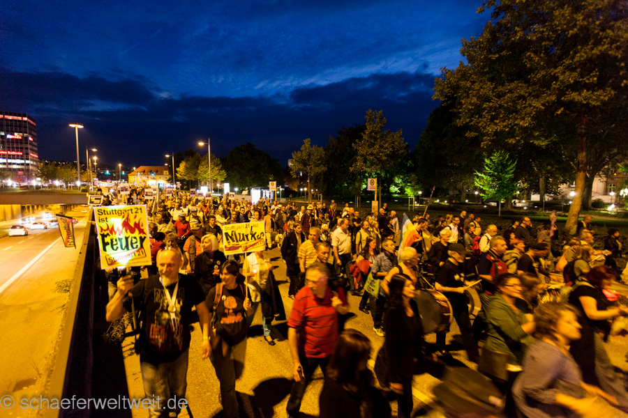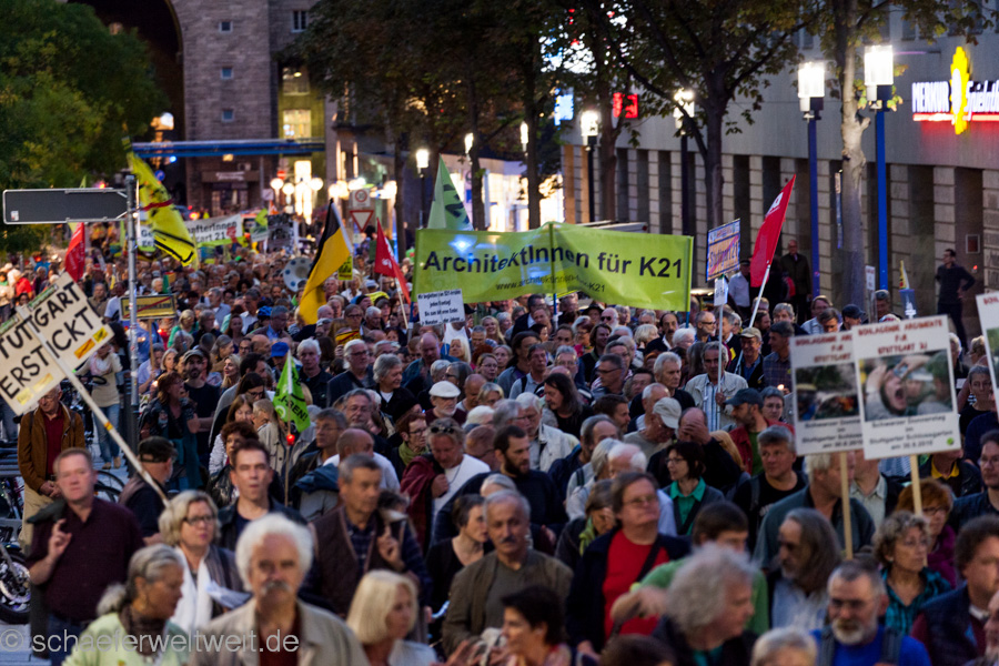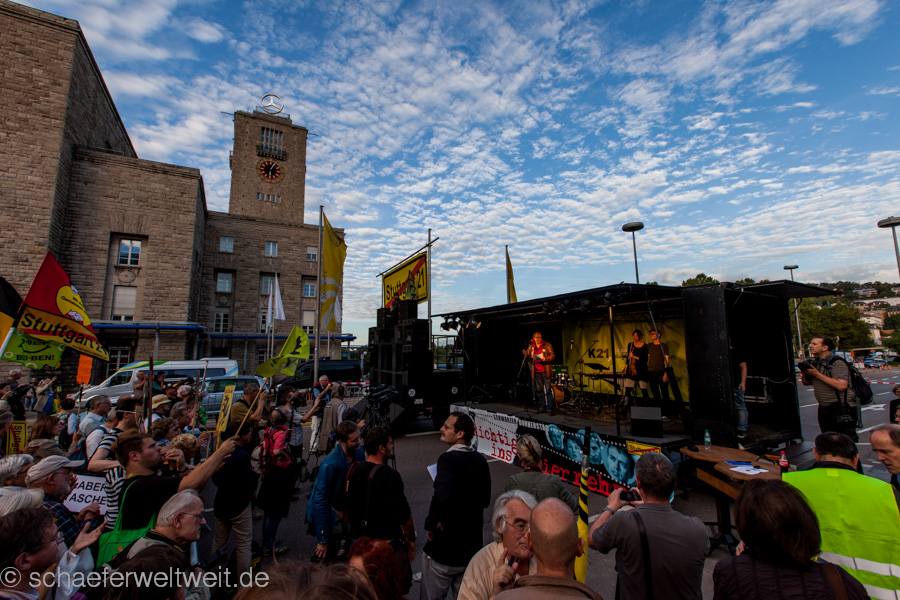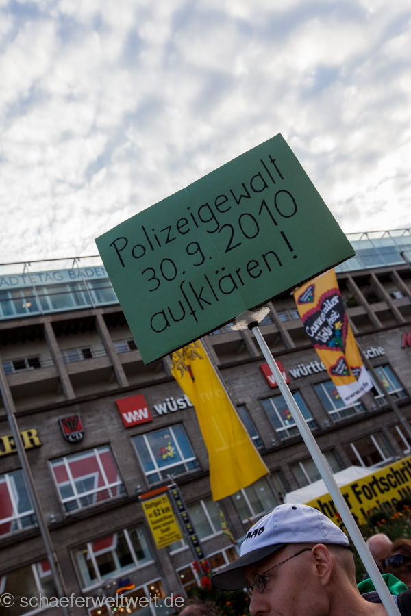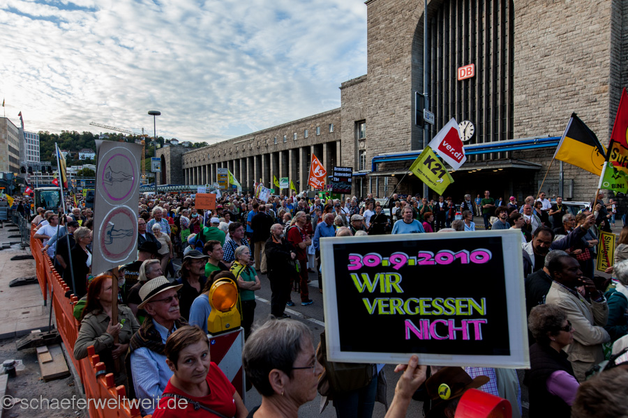 In einer kraftvollen Demonstration versammelten sich ca. 2000 Stuttgart 21 Gegner vor dem Kopfbahnhof in Stuttgart und gegen Stuttgart 21. Sie erinnersten gleichzeitig an den morgigen Jahrestag des als „Schwarzer Donnerstag“ bekannt gewordenen Ergenisses im Jahr 2010. Damals wurde unter der Regierung des nie offiziell gewählten Stefan Mappus, Gewaltsam ein Stück Park geräumt. Beim Einsatz der sich recht schnell als Illegal erwies, da vom Eisenbahnbundesamt die Fällung schriftlich untersagt wurde, wurden vor vier Jahren weit über 300 Demonstranten teils sehr Schwer verletzt.