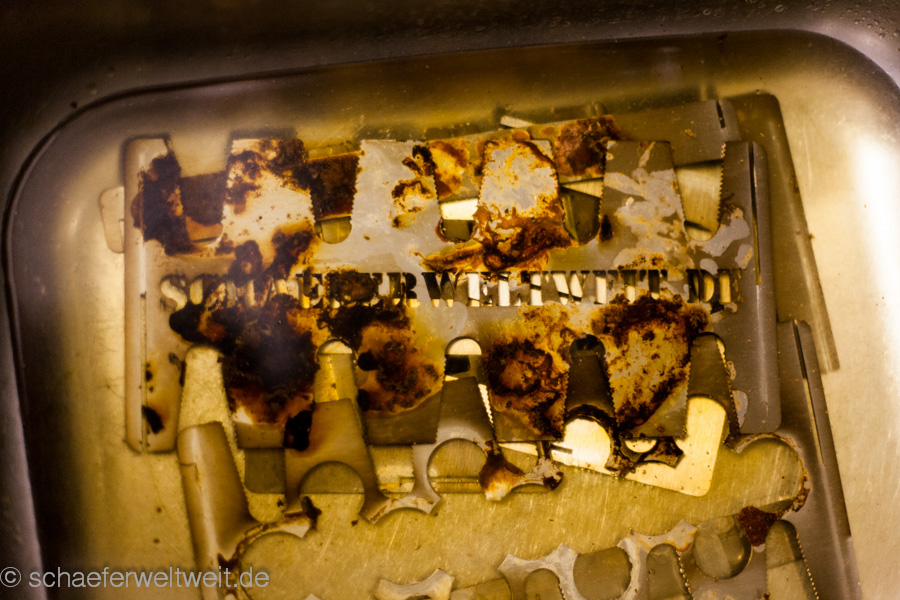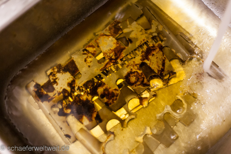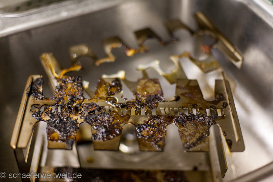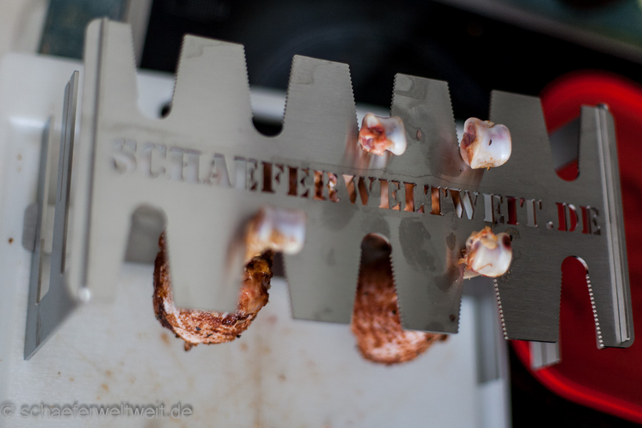 Vorteil ist hier zb. die verschiedenen größeren Löcher bzw. die Möglichkeit mehrere Löcher zu kombinieren. Auch andere Dinge die man nicht direkt auf dem Rost machen möchte kann man hier „einspannen“ (zb. Putenbruststücke etc.). Die Reinigung ist auch einfacher als bei vielen festen Modellen. Man kann die Bleche zum einweichen auseinander stecken und so mit einer geringen Wassermenge einweichen. Genauso ist es in Einzelteilen einfach möglich die Platten zu bürsten. Nicht zuletzt lassen sie sich dann auch Platzsparend lagern! Alles in allem ein interessantes System und zudem ist es auch möglich die Form genauso anzupassen wie hier in dem Fall die gelaserte Schrift schaeferweltweit.de! Bei interesse – einfach mal bei Timo Schill melden und nachfragen – auch andere Metallarbeiten sind hier umsetzbar (zb. auch ein Individueller Grillrost oder eine Sonderform für eine spezielle Anwendung oder einen Grilldurchmesser für den es keine Standard-Grillroste etc. gibt.).