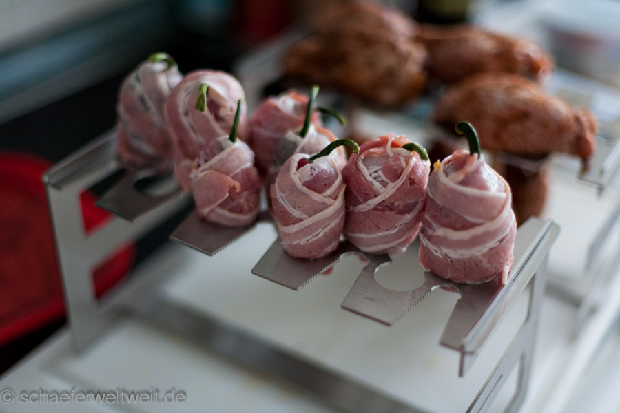 Man kann alles improvsieren (oder auch direkt auf den Rost legen) aber manche Dinge erleichtern doch das Leben des Grillsportfreundes. So zb. ein Halter der hilft Jalapenos oder anderes, geordnet und am Platz zu halten. Oft nutzt man zb. auch für Chickenwings / Hühnchenflügel oder „Drumsticks“ / Hähnchenunterschenkel spezielle Halter. Spätestens bei Spareribs / Schweinerippchen sind Halter fast unerlässlich – vor allem weil man sonst viel Platz verschenkt. Natürlich kann man auch hier wie gesagt improvisieren! Hier zb. eine alte, mehrfach gebrauchte „Grillplanke“ welche mittels einfacher Nägel recht lange als Jalapenohalter gedient hat …