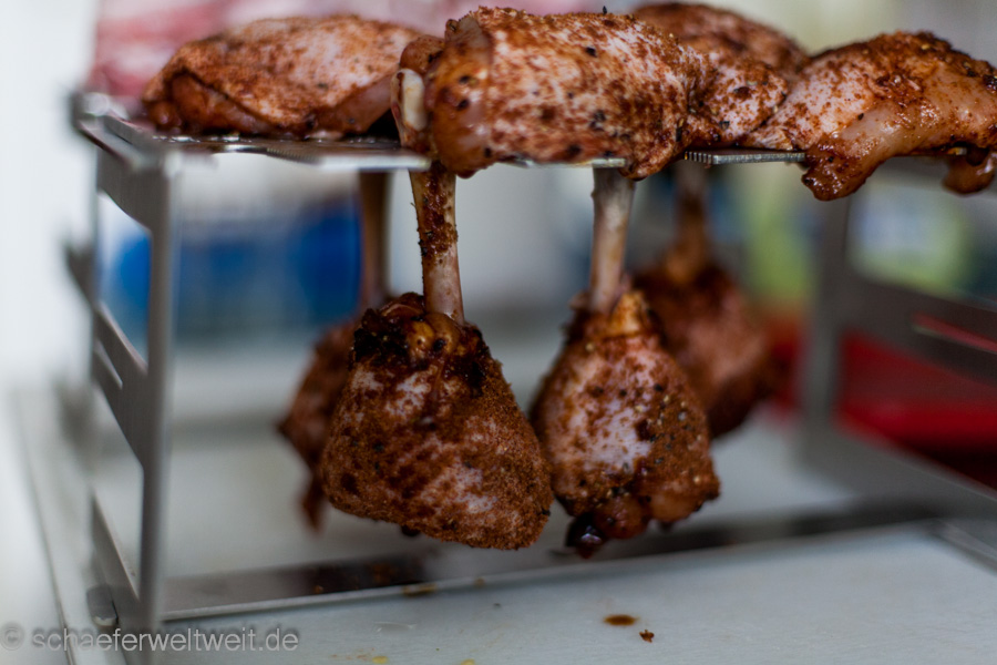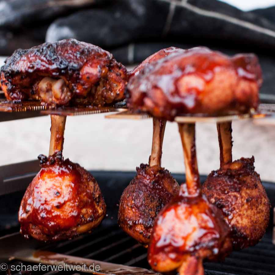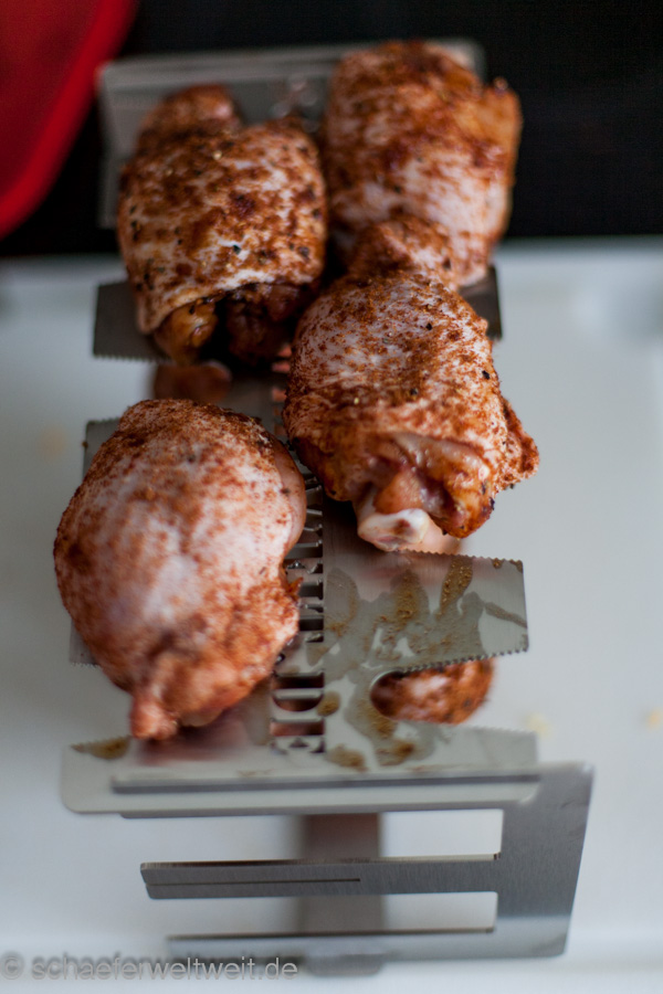 Im Handel gibt es natürlich auch fertige Versionen. Meist sind diese aber zu klein (siehe folgendes Bild!) oder zu nah beieinander angeordnet. Hier ein Halter von Steve Raichlen.