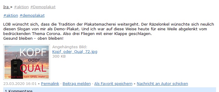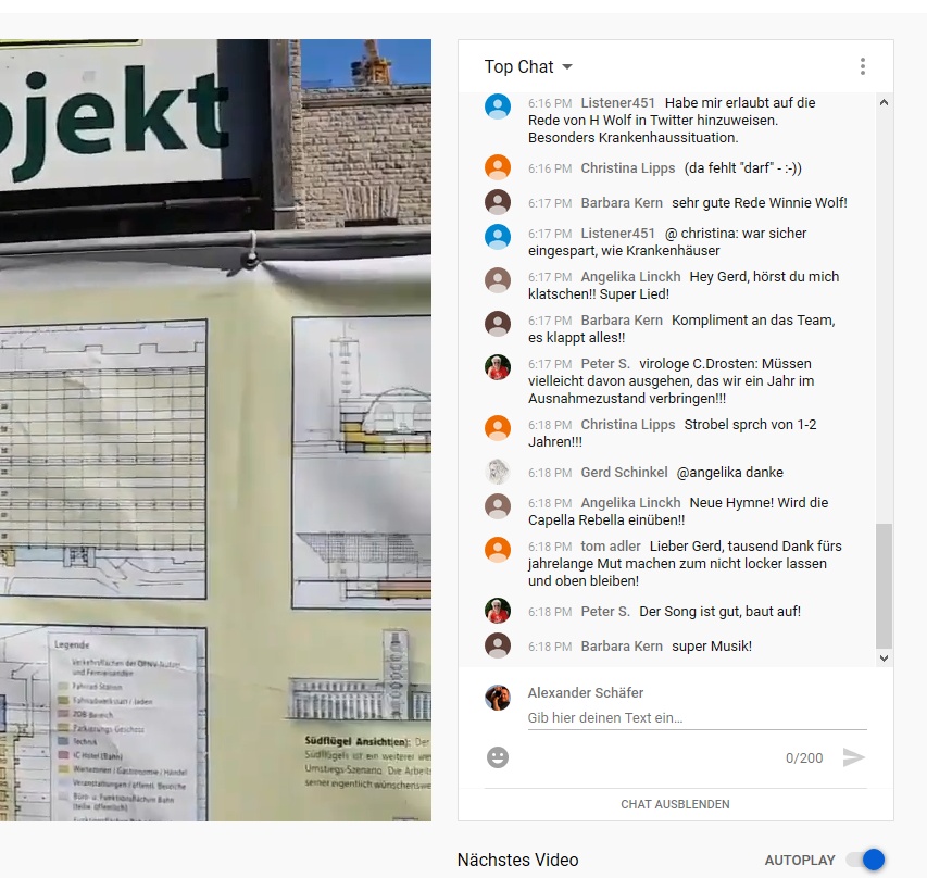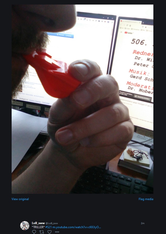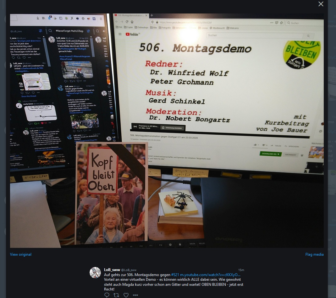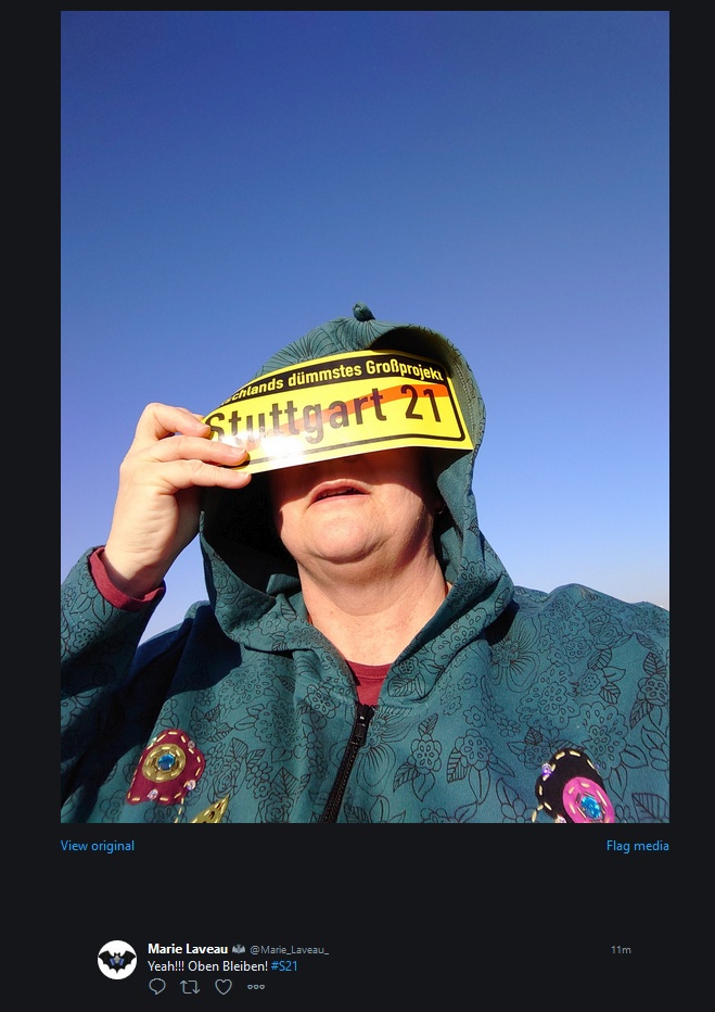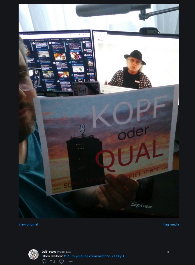 Natürlich fordern die aussergewöhnlichen Umstände nicht nur die Redner und Veranstalter herraus, nein auch die Teilnehmer müssen sich ein bishen mehr anstrengen als sonst um sichtbar gegen das Immobilienprojekt Stuttgart 21 zu demonstieren! Wer Aktiv teilnehmen will kann entweder live während der Demo in seinem bevorzugten Social-Media-Kanal seine Teilnahme selbst kund tun oder auch (kurze!) Videos oder Bilder als Grußworte an demoteam AT unser-park.de schicken!