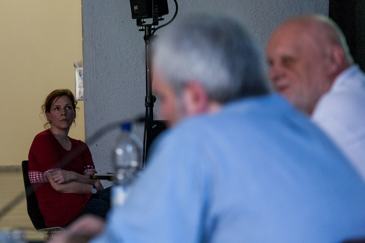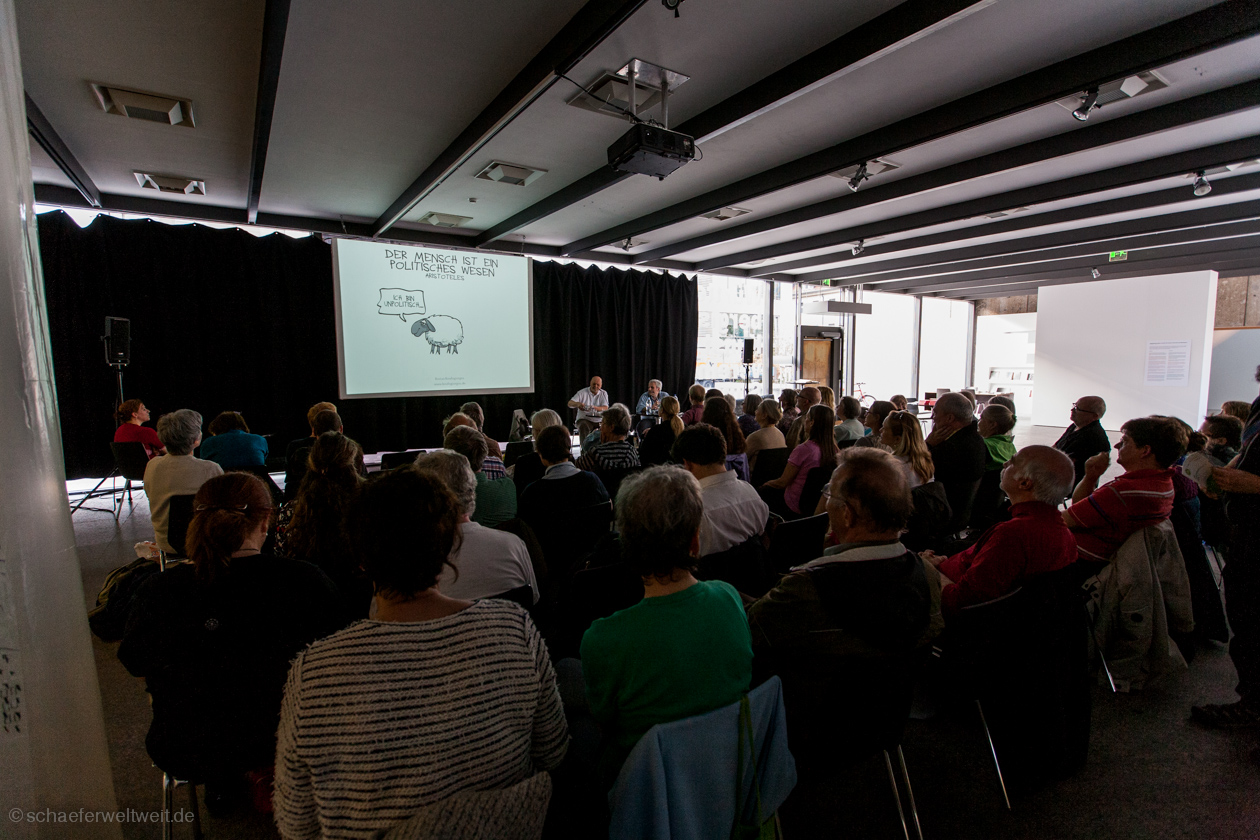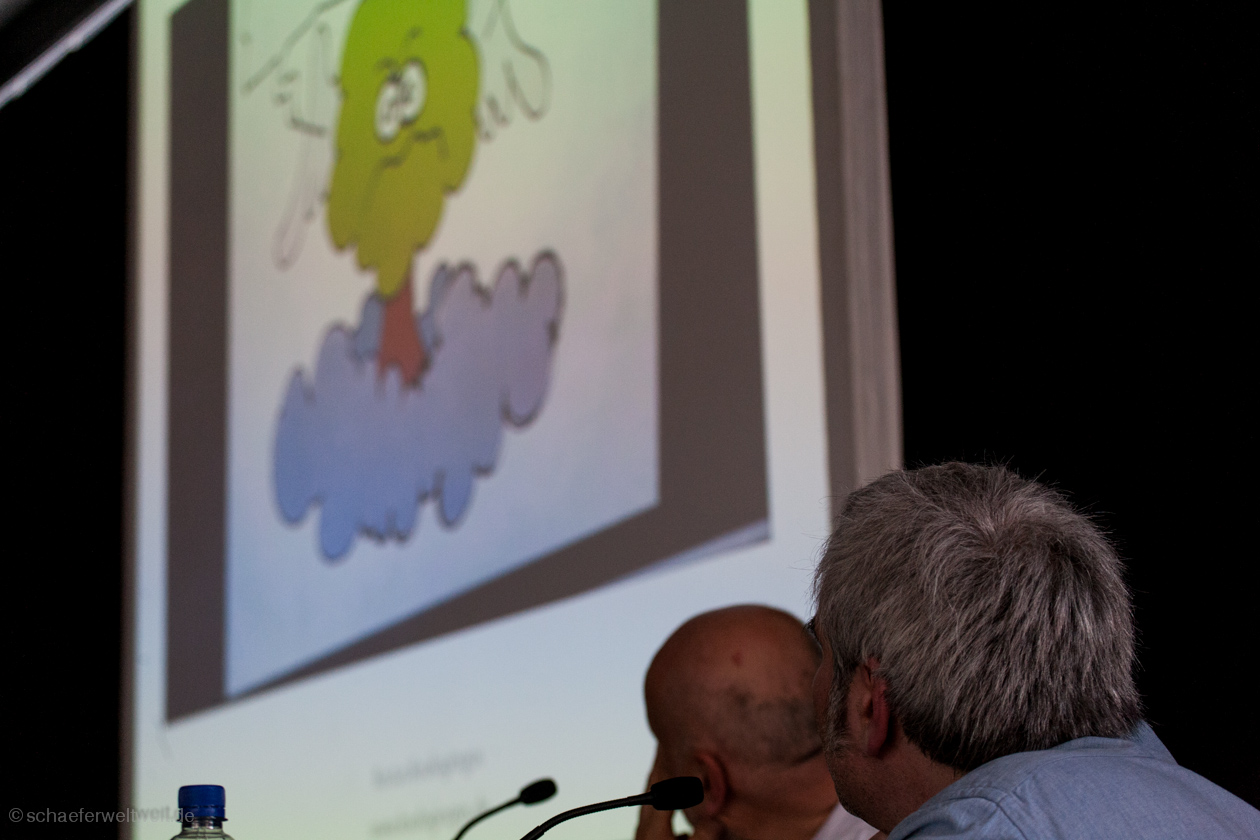 Man denkt – na, dieses Element sagt mir doch was… schaut nach und erkennt – klar, das ist doch hier schon mal vorgekommen. Dabei meine ich aber keine „Ideen“, die wiederverwendet oder kopiert werden – sowas hat Nadja Menze nicht nötig. Nein, es sind die Details, die unbedarften Betrachtern gar nicht auffallen: sei es eine Situation in der U-Bahn, die an einen alten Perscheid-Cartoon erinnert, die Anspielung auf christliche Wunder, die schöne Erinnerungen weckt, der jugendliche Rapper, der sich wiederfindet und Storys aus der Bibel aufgreift, der Stechschritt im Hintergrund, der schon bei Perscheid auftauchte, der allseits bekannte und täglich präsente Kriegstreiber, der auf ähnliche Weise ‚hops‘ genommen wird, die Altersvorsorge im Stil der Star-Trek-Finanzierung in einem Perscheid-Cartoon, der Umgang mit emotionalen Momenten bei Männern und Frauen, der Fisch am Heck eines Autos, die Glocke im Zusammenhang zügelloser Hingabe zu seinen Trieben, die schlaue Oma, die ihrem technikaffinen Enkel einen einschenkt, die durch die Blume ‚hops‘ genommene Querdenkerin, das kleine Schuhpaar unter der Soutane oder sei es auch nur die als Insider durchaus sehr bekannte und doch so unscheinbare Teppichfalte.