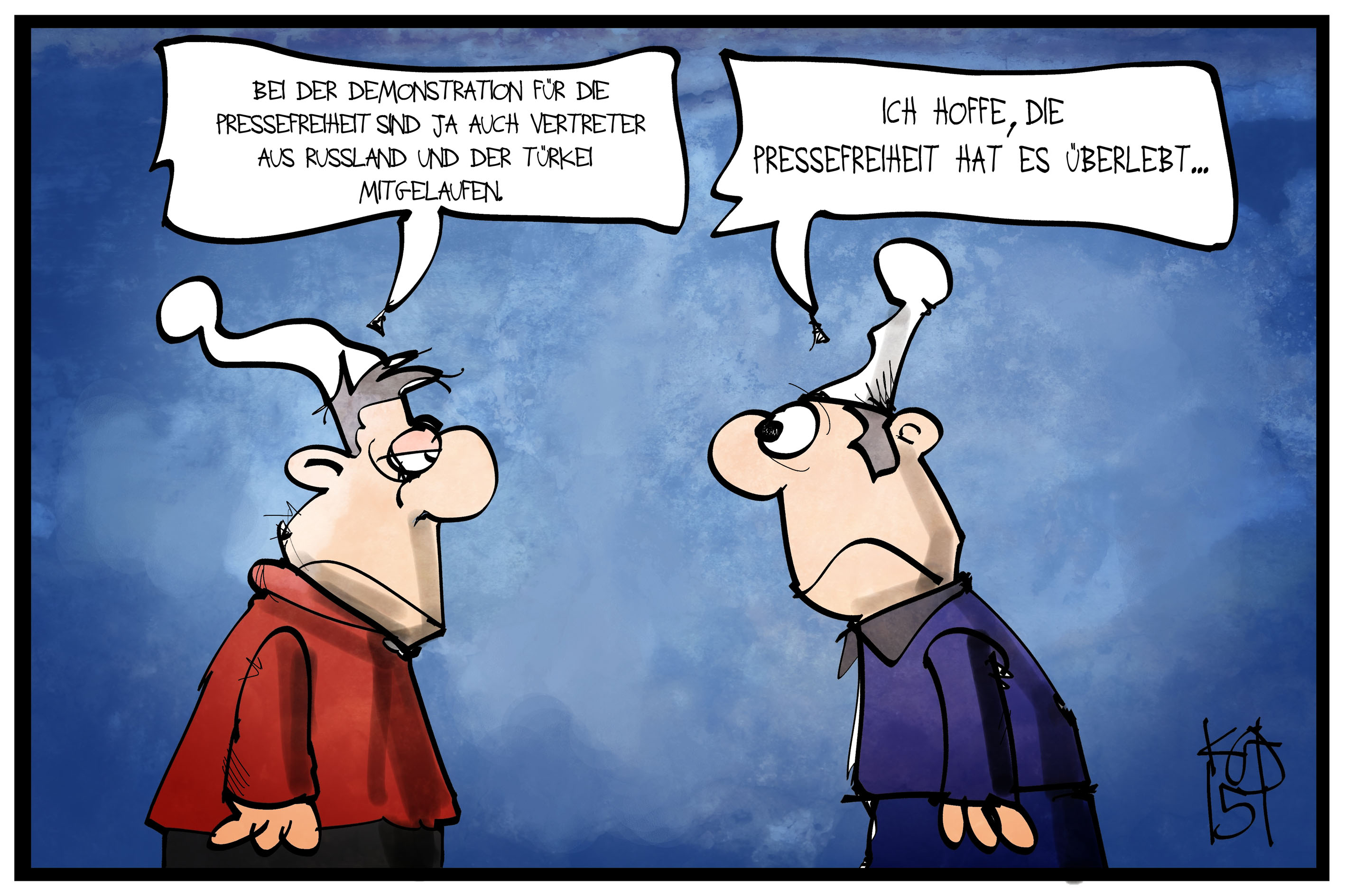 Bereits gestern hat der Stuttgarter Karikaturist Kostas Koufogiorgos es wieder einmal geschafft, die Dinge gewohnt hervorragend auf den Punkt zu bringen. Am Tag des Anschlags auf so vieles, nicht zuletzt viele Menschen die direkt ihr Leben verloren, war mir klar, dass wie immer bei solchen Sinnlosen Akten grenzenloser Gewalt, viele Opfer zu beklangen sind. Nicht zuletzt auch die vielen Muslime die einfach nur Ihren Glauben leben möchten. Man mag viele der Arbeiten von „Charlie Hebdo“ (übrigens gegen ALLE Religionen) gut oder schlecht finden (bedauerlicherweise verstehe ich kein Französisch um deren Sinn wirklich erfassen zu können) doch hier gilt der so oft zitierte Satz „I disapprove of what you say, but I will defend to the death your right to say it.“ (Evelyn Beatrice Hall)
