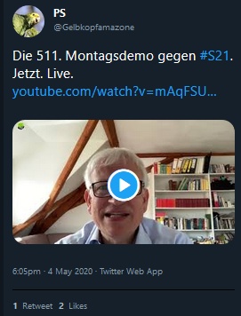 Natürlich fordern die aussergewöhnlichen Umstände nicht nur die Redner und Veranstalter herraus, nein auch die Teilnehmer müssen sich ein bishen mehr anstrengen als sonst um sichtbar gegen das Immobilienprojekt Stuttgart 21 zu demonstieren! Wer Aktiv teilnehmen will kann entweder live während der Demo in seinem bevorzugten Social-Media-Kanal seine Teilnahme selbst kund tun oder auch (kurze!) Videos oder Bilder als Grußworte an demoteam AT unser-park.de schicken!