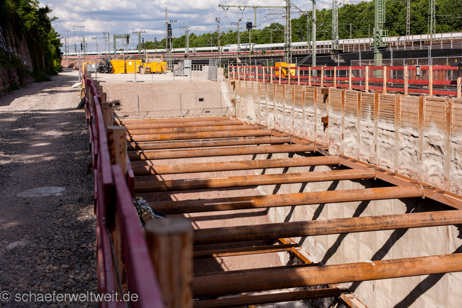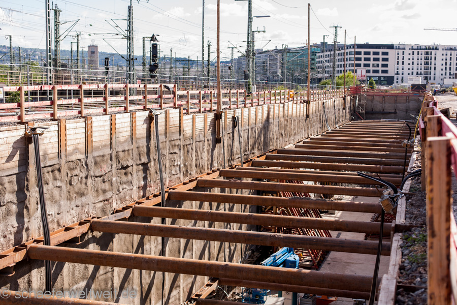 Man erkennt hier den Bau des neuen S-Bahntunnels vom HBF zur geplanten Haltestelle „Mittnachtstraße“ und zwar im Bereich zwischen „UFA-Palast“ und Wolframstraße. Wie über genau diesem Bereich sollte eigentlich die Baustraße und auch die SSB-Linie U12 gebaut werden. Bevor die Sbahn nicht fertig gebaut ist und bevor die Wolframstaße nicht verschwenkt ist kann dies aber gar nicht begonnen werden. Wie man sieht ist bisher noch nichts vom S-Bahn-Tunnel betoniert geschweige den an einen Deckel darüber auch nur zu denken.