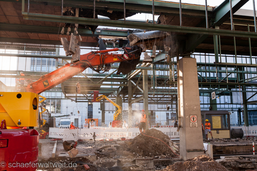 Heute am Montag den 05.08.2013 stehen nur noch die kleine Schalterhalle, der Säulengang, der Mittelausgang, die große Schalterhalle und die Kopfbahnsteighalle. Das Bahnsteigdach über den Gleisen ist mittlerweile fast nur noch ein funktionsloses Gerippe geworden. Durch gröbste Fehler während des Abrisses des Schlossgartenflügels wurde es massiv geschädigt und später auch Aufgrund des hieraus resultierenden Sicherheitsriskos für die Fahrgäste, sämtliches Glas aus dem Dach entfernt. Heute zeigt sich im Winter sowie bei Regen wie tiefgreifend die Zerstörungen an dem Dach sind. Ebenso wurden die Gleisanlagen durch den Umbau für Stuttgart 21 massiv geschädigt – was sich unter anderem sehr eindrücklich in einer beispiellosen Entgleisungsserie rund um die Weiche 227 (auch hier im aktuellen ARD Bericht Minute 2:40 ) gezeigt hat. Später soll auch noch die große Schalterhalle (für eine neue Treppenanlage) dem Immobilienwahn geopfert werden. Ob das Wahrzeichen der Innenstadt – der Stuttgarter Hauptbahnhofsturm – diese und kommende Bausünden überleben wird, ist ebenso fraglich da die Deutsche Bahn bisher nicht gerade mit ihren Bauqualitäten geglänzt hat. Wie oben beschrieben wurde der Südflügel vor dem Turm gebaut. Die Unfähigkeit in Statischen Belangen und ihren kapitalen Dachschaden (an Gleis 16), bewies die DB bereits beim erwähnten sinnlosen Abriss des Schlossgartenflügels.