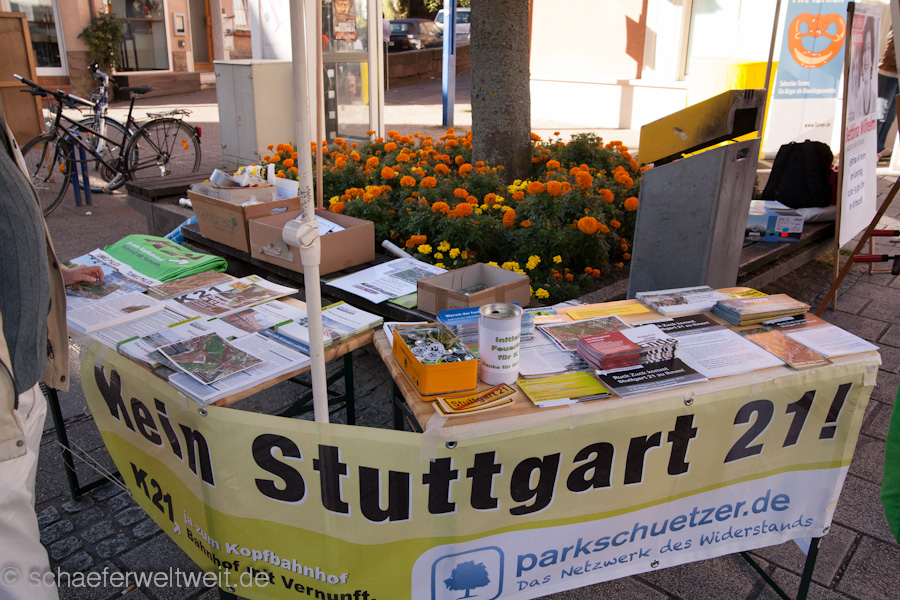 Am Samstag, 8. September, findet in und um Stuttgart ein großer Aktionstag gegen S21 statt: Unter dem Titel „Potz Blitz, betrifft Stuttgart 21 auch mich?“ informieren Schwabenstreichgruppen und Stadtteil-Netzwerke allein in Stuttgart an 14 Standorten über die Folgen von S21 für die Anwohner. Auch in Ludwigsburg und Tübingen sind Gruppen gegen S21 aktiv.