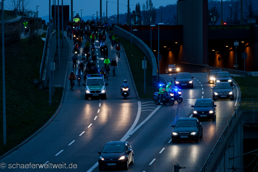 Jeden ersten Freitag im Monat treffen sich in Stuttgart einige Hundert Radfahrer zur Demo für das Fahrrad. Die Radfahrer erobern sich für kurze Zeit ihren Raum im Straßenraum zurück, selbst wenn dieser Freitag nun der Karfreitag ist.