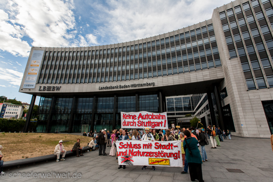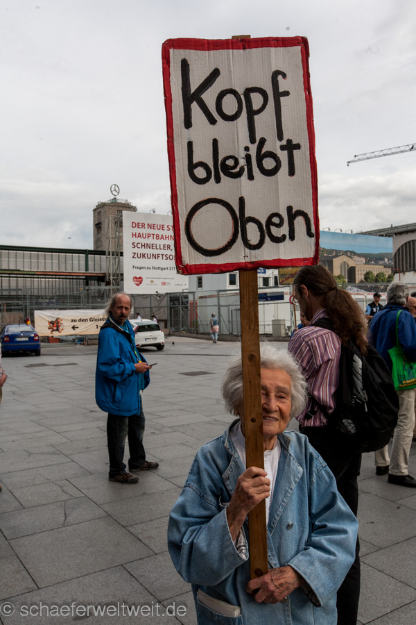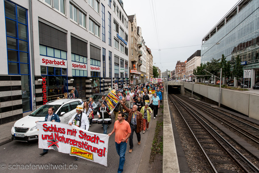 Zum zweiten Mal fand die Montagsdemo gegen Stuttgart 21 in Bad Cannstatt, diesmal allerdings auf dem Marktplatz statt. Von diesem Marktplatz könnte sich der trostlose hässliche Stuttgarter Marktplatz mehrere Scheiben abschneiden! Nach einer Stimmungsvollen Demo unter Bäumen, folgte ein kraftvoller Demozug der sich sehen lassen konnte. Auf so manch ungewöhnlichem Weg (über zb. eine schmale Fußgängerbrücke) führte der Zug zu den beiden vom Abriss akut bedrohten Stegen über den Neckar und die Bundesstraße bei der Wilhelma.