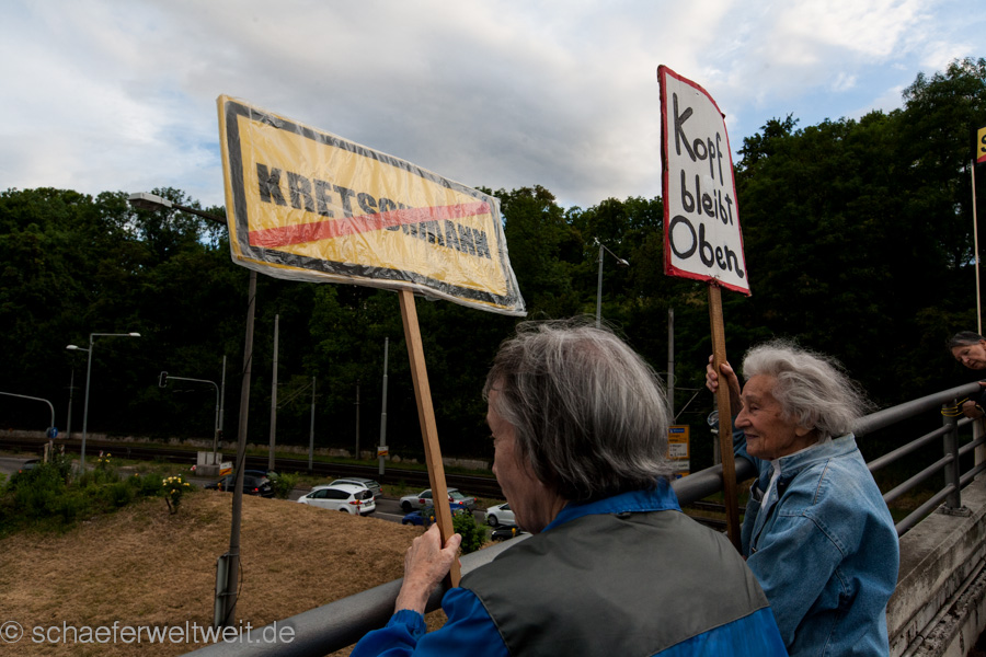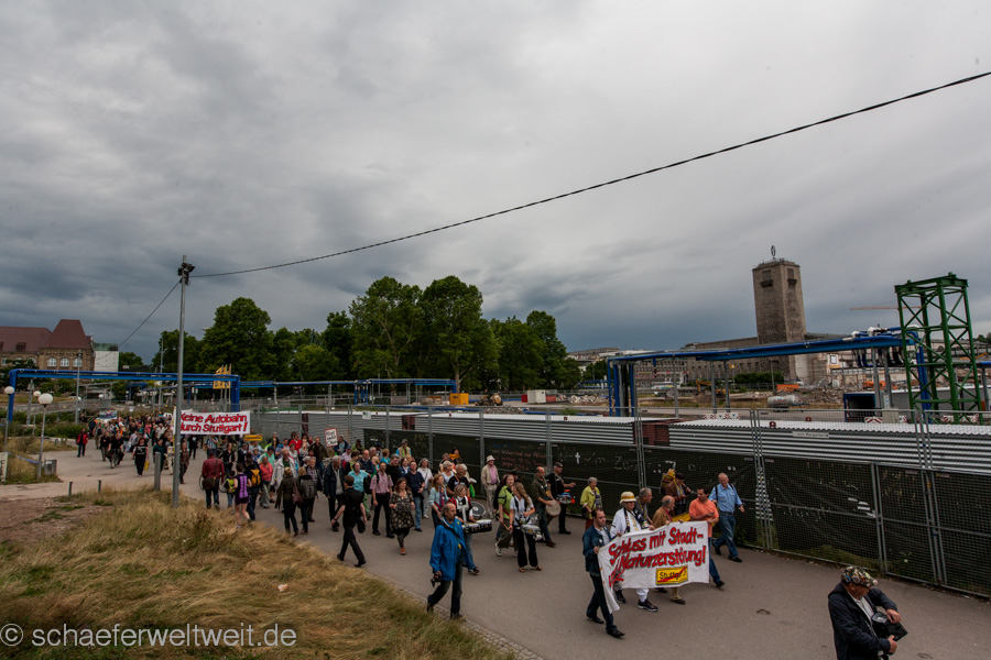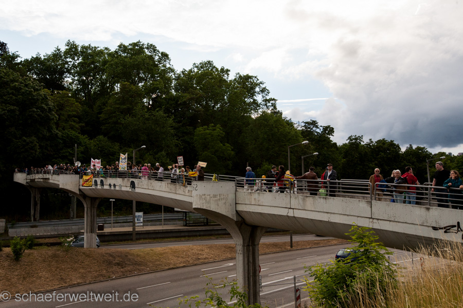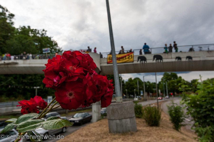 Am Sonntag trafen sich rund 150 Menschen um in einem Demonstrationszug vom Stuttgarter Kopfbahnhof zum „Elefantensteg / Wilhelmasteg“ zu ziehen. Diese Wegeverbindung zwischen Bad Cannstatt und dem Rosensteinpark wird in der kommenden Woche für die Bauprojekte „Rosenstein-Straßen-Tunnel“ und „Stuttgart 21“ wegfallen.