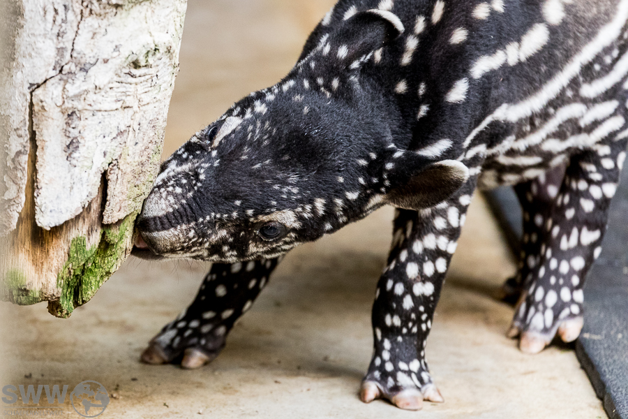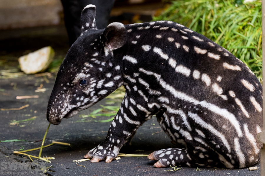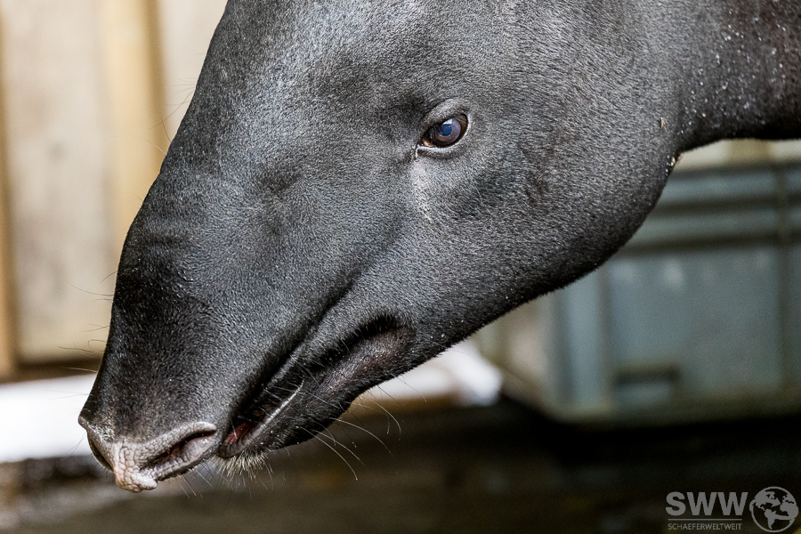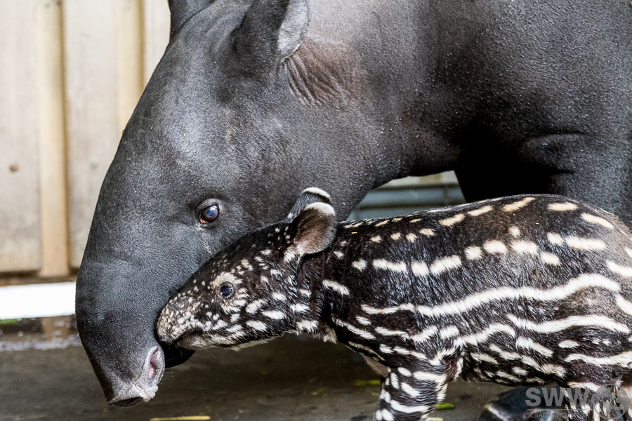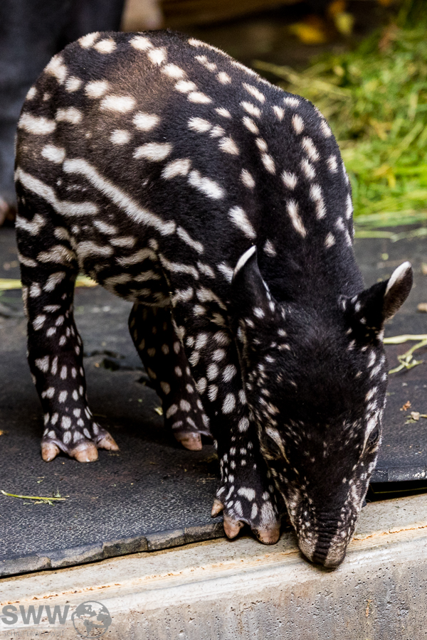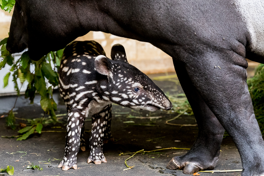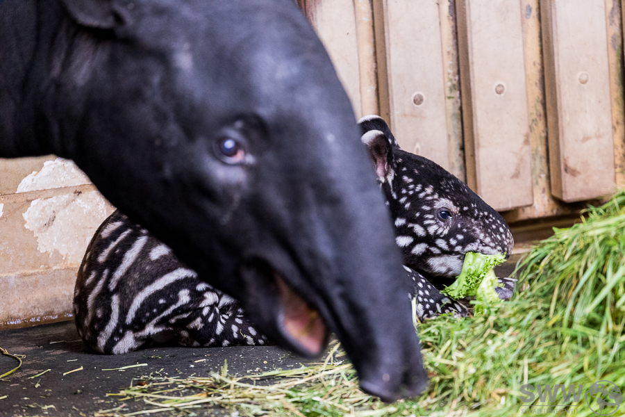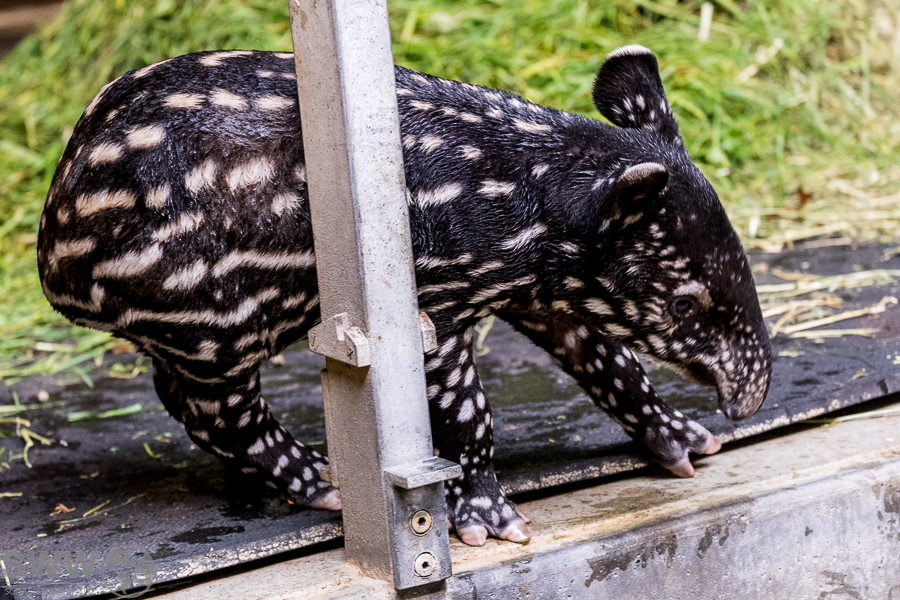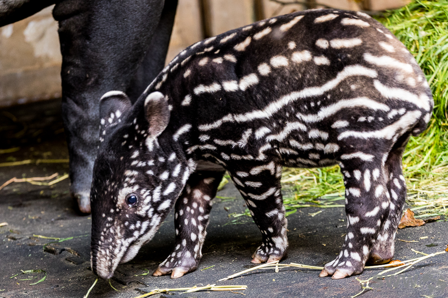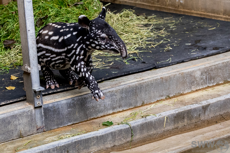 Hier sind einige Eindrücke aus dem Tapirhaus. Am 04.10.2024 erblickte ein kleiner Schabrakentapir das Licht der Welt, auf den Bildern hier ist das Alter also acht Tage. Wie sich inzwischen herausgestellt hat, handelt es sich um ein Weibchen, das die ersten Wochen ausschließlich im Innengehege und im nicht für die Öffentlichkeit zugänglichen Außengehege verbringen wird. So wird es dem Nachwuchs erleichtert, sich behutsam an diese neue, eindrucksvolle Umgebung zu gewöhnen.
