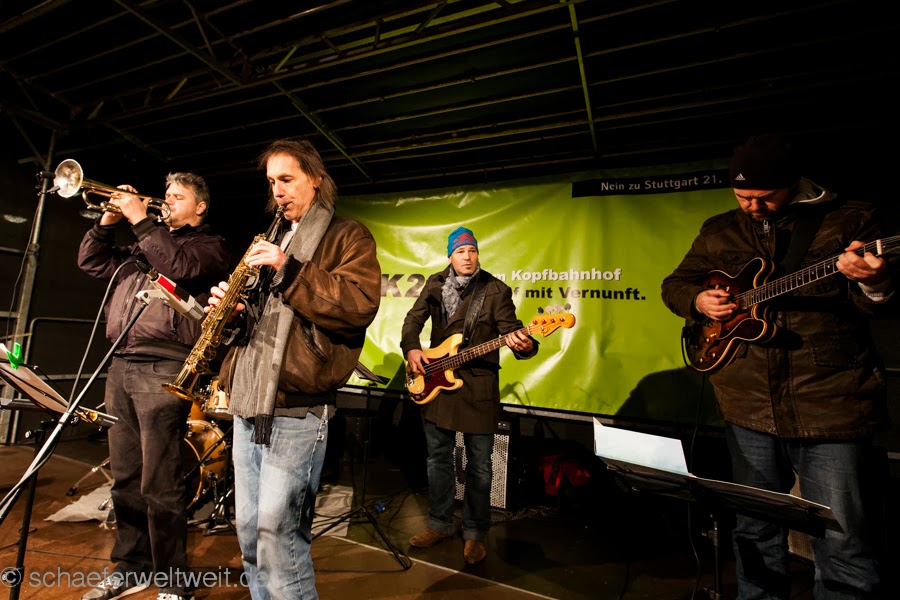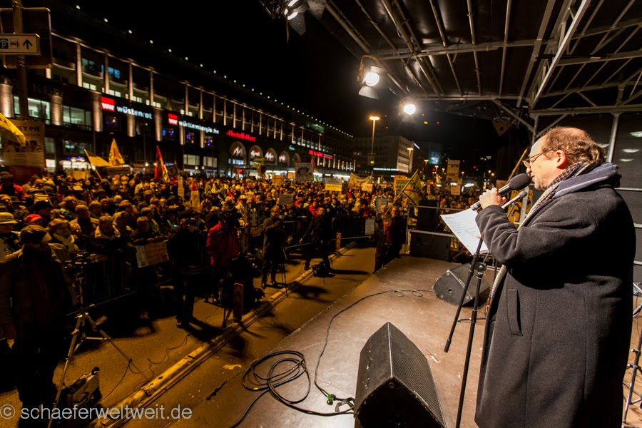 Endlich nach vielen Monaten der Irrwege auf komischen Plätzen findet die Montagsdemo wieder zurück an den kasus knaxus, den Ort des Geschehens – den Kopfbahnhof in Stuttgart. Mag man den Organisatoren glauben, wird die Stolze Silhouette der Reste des Bonatzbaus wohl auch für länger wieder Ort des Montäglichen Treffens sein. Wenn auch der Anblick mittlerweile unter den Geschmacklosen blauen Rost-Rohren des Murks21 Projektes leidet, bieten diese Steine des Anstoßes doch Grund genug sich hier zu Treffen. Auch wenn man sich immer klar sein muß, dass direkt hinter der Fassade die DB mit Ihrem massiven Dachschaden am Bahnhofsdach sinnlos und verantwortungslos wütet solange niemand Vernünftiges ihr das Handwerk legt.