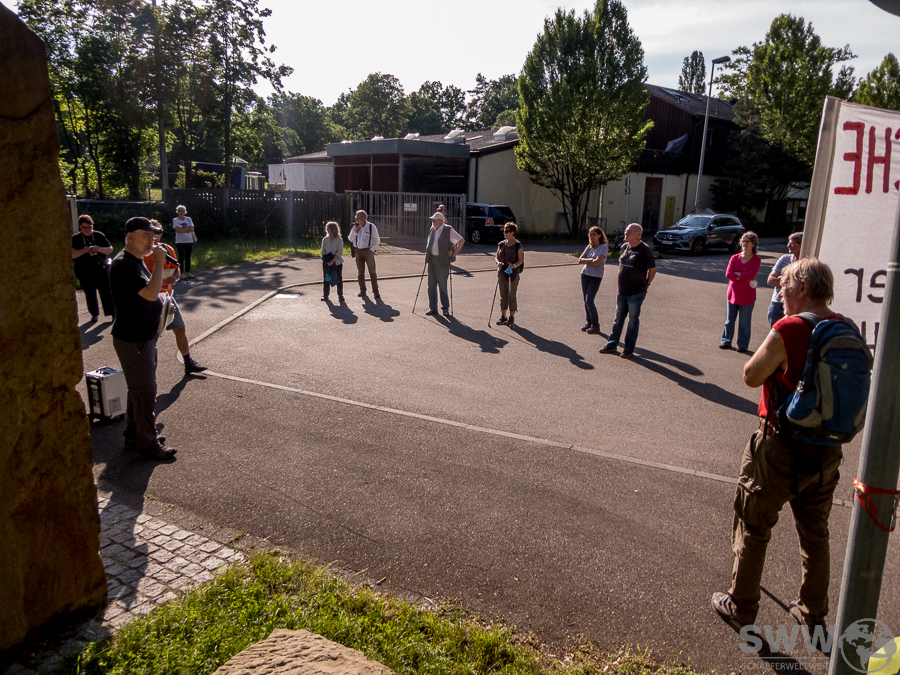 Rund 20 Interessierte kamen am 24.06.2021 an der Hirschsprungallee 18 (Link) zusammen um vom Schicksal tausender Zwangsarbeiter (Link) zu erfahren. Dort wo heute Sport und Spiele statt finden befanden sich ab 1942 Baracken (Link) in welchen  zwischen 1500 und 3000 Zwangsarbeiter vieler Nationalitäten für die Firmen Porsche sowie Heinkel-Flugmotorenwerke (ehem. Hirth) untergebracht waren. Selbst nach dem Krieg bis 1967 wurde das Gelände weiter für Vertriebene, Flüchtlinge sowie sog. „Dispaced People“ (Heimatlose) genutzt.