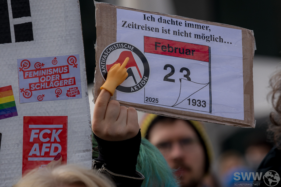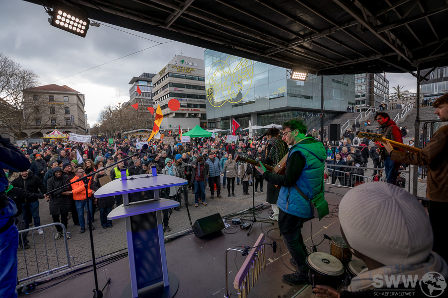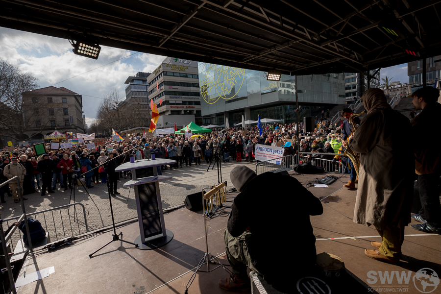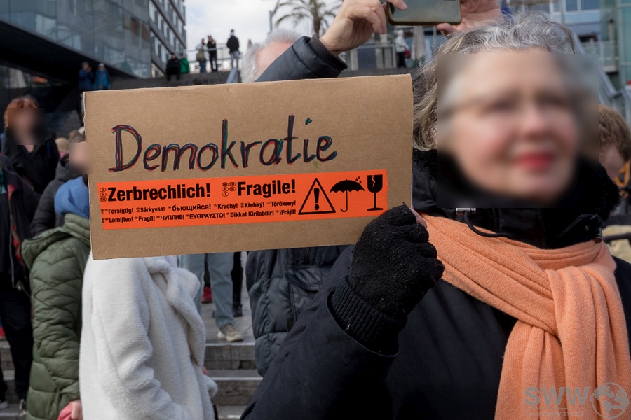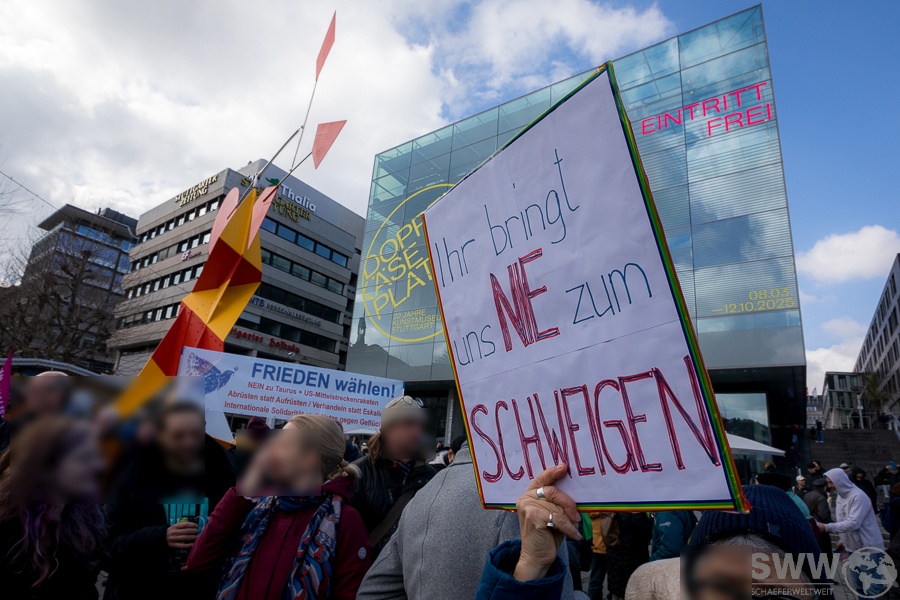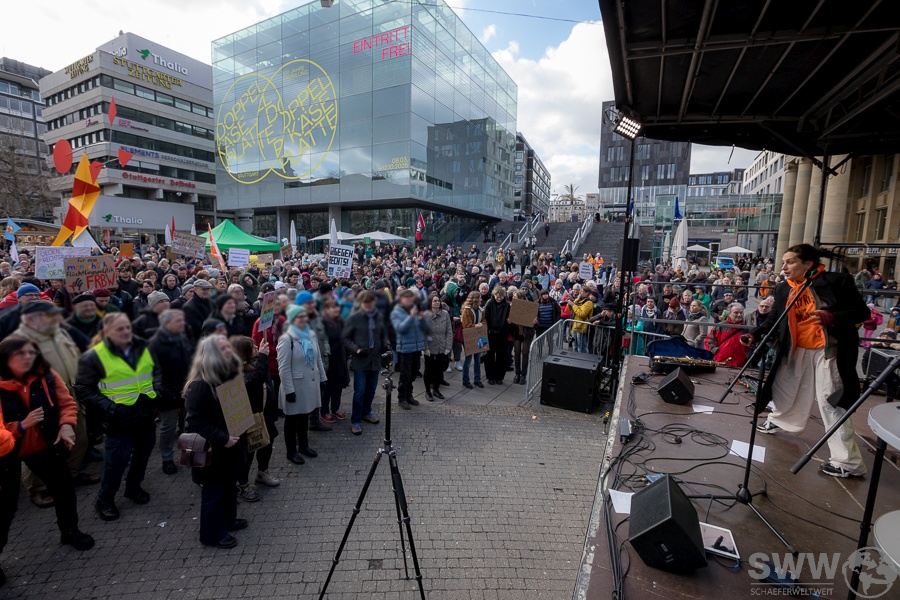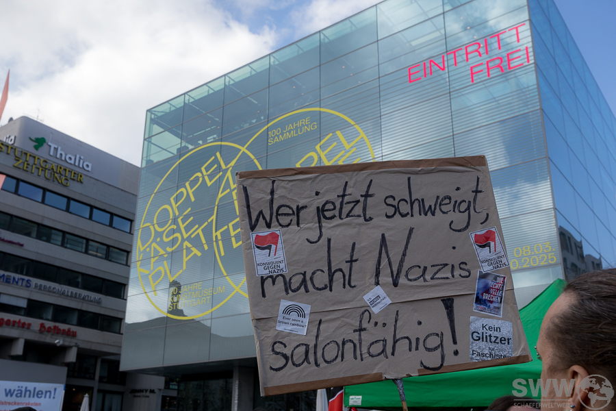 Am 22. März 2025 trafen sich im Stadtgarten in Stuttgart etwa 2.000 Demonstranten, um einem bundesweiten Aufruf zu Demonstrationen in allen Bundesländern zu folgen. Eine Gegendemo direkt auf dem Börsenplatz, in etwa 200 Metern Luftlinie, zeigte hingegen, dass Rechte Demos in Stuttgart nicht weit kommen.