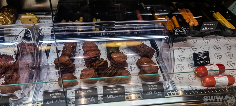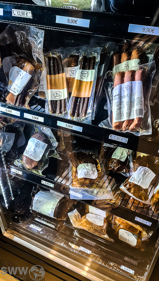Die Regale und Kühltheken boten eine große Auswahl an fertig verpackten Produkten. Die Thekenauslage erinnerte an eine typische Metzgerei, wirkte auf mich optisch jedoch eher unattraktiv – fast könnte man meinen, als wolle man bewusst den leicht „abgenutzten“ End-des-Tages-Look einer klassischen Fleischtheke mit leicht angetrockneten Wurstscheiben imitieren.