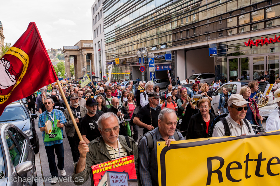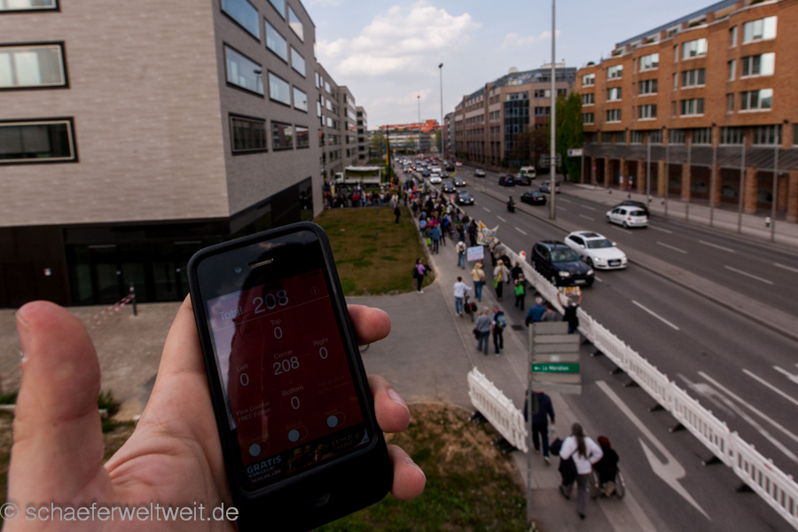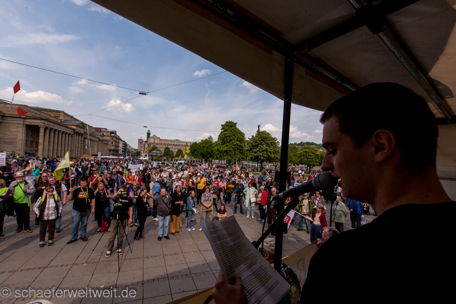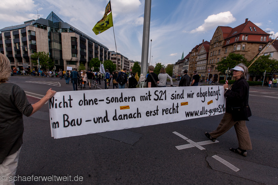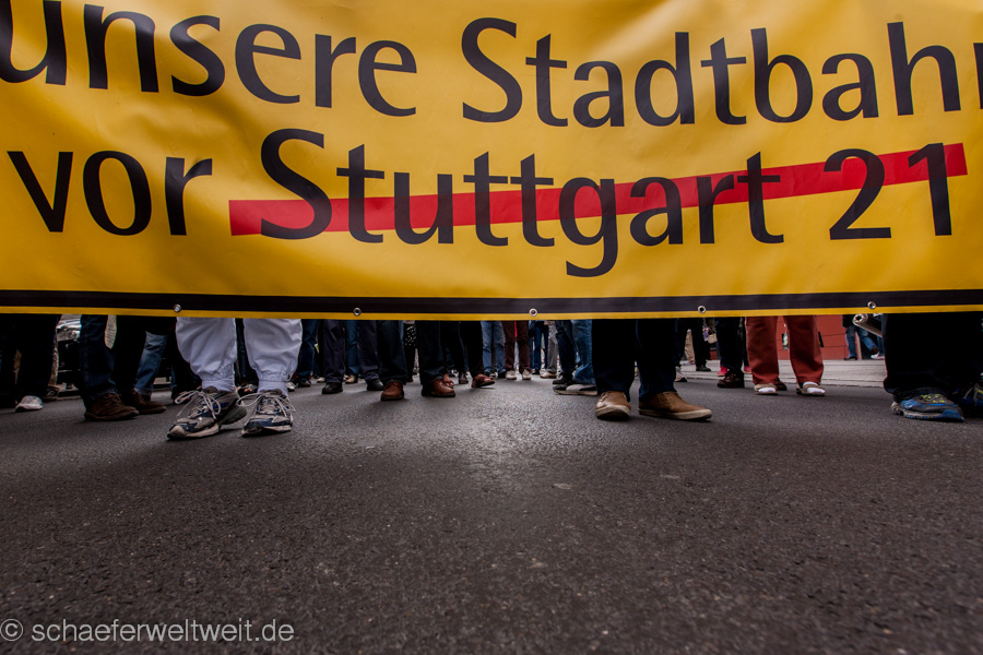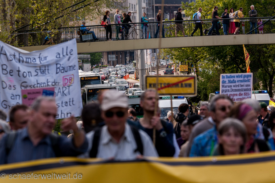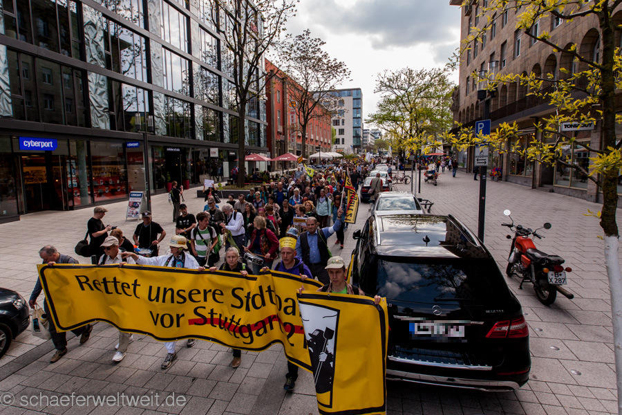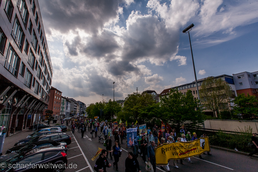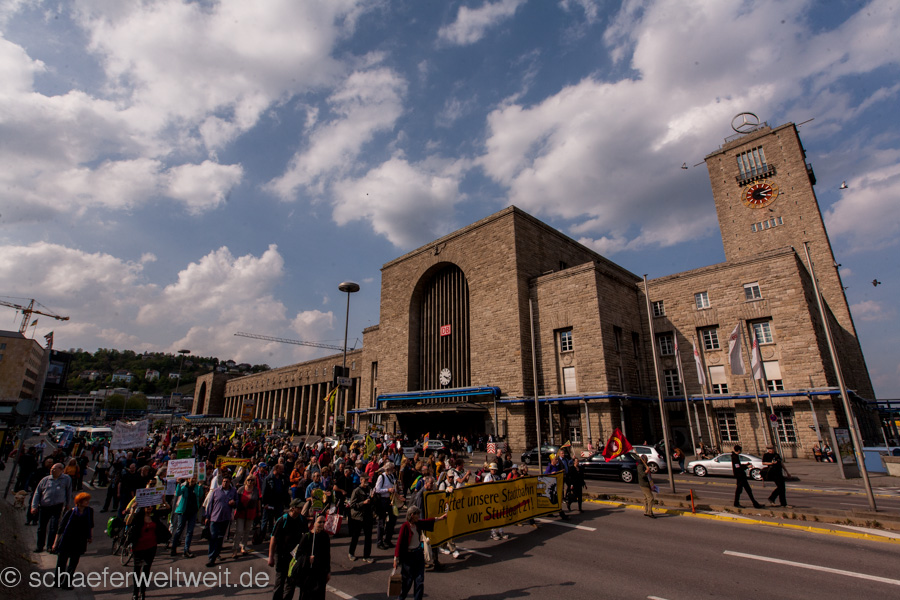 Bereits zum neunten Mal fand am 12.04.14 die „Laufdemo“ (link) gegen Stuttgart 21 statt. Diesmal startete diese am Verkehrsministerium, führte dann mit einer Zwischenkundgebung über den Schloßplatz und endete vor dem Innenministerium. Gegen Ende der Demo zählte ich unter dem Wulle-Steg 208 Teilnehmer.