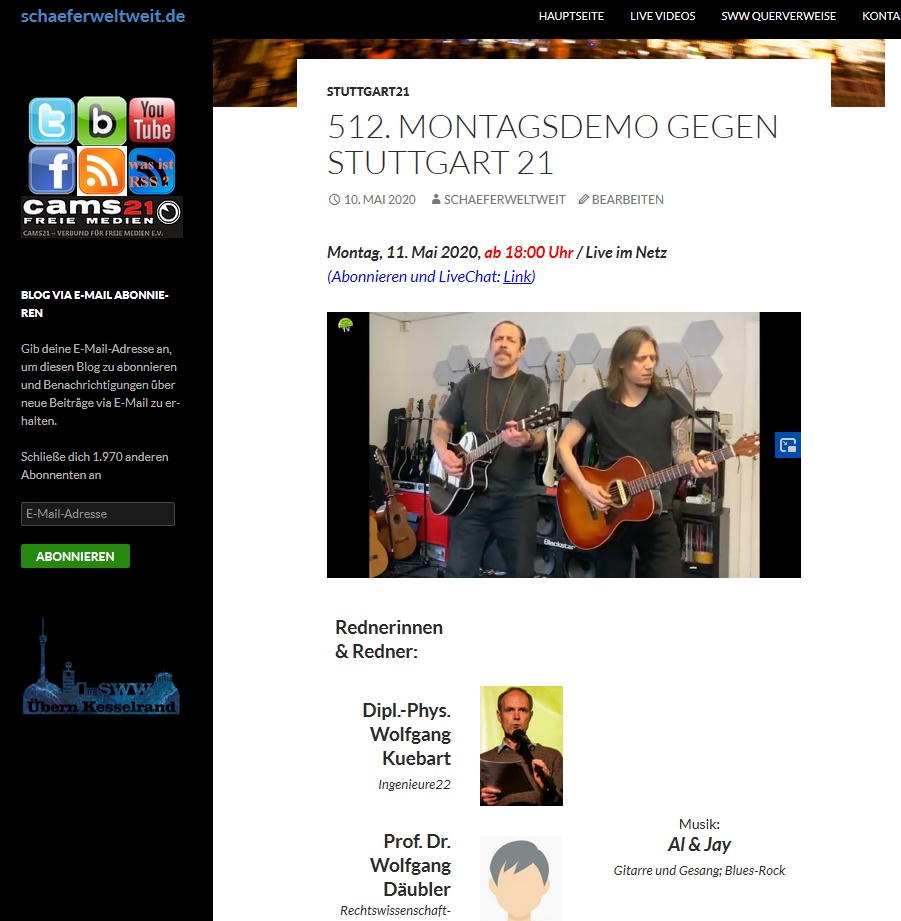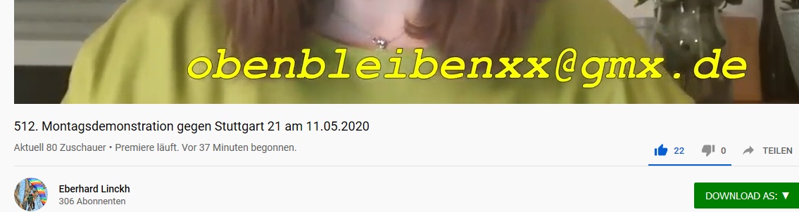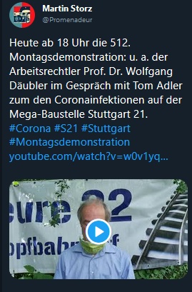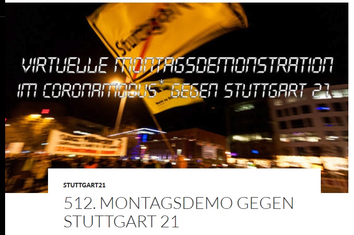 Info vom Demoteam zu den Montagsdemos gegen Stuttgart 21 Die Demo am Montag, 14.12.2020 findet aus organisatorischen Gründen noch auf dem Marktplatz statt, danach wird ab Montag, den 21.12.2020 wieder online demonstriert werden. Am besten also direkt OBEN-BLEIBEN-TV (Link) abbonieren um stehts nichts zu verpassen.