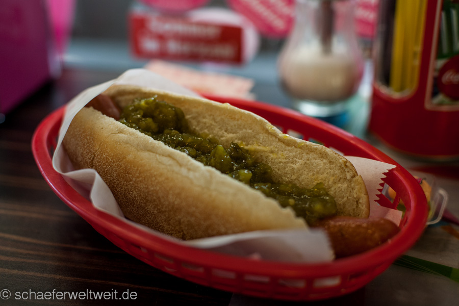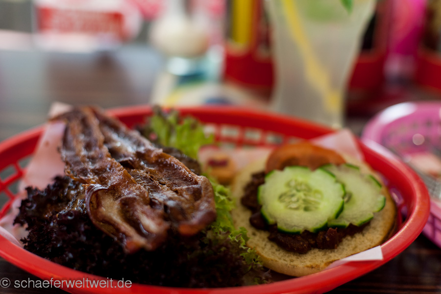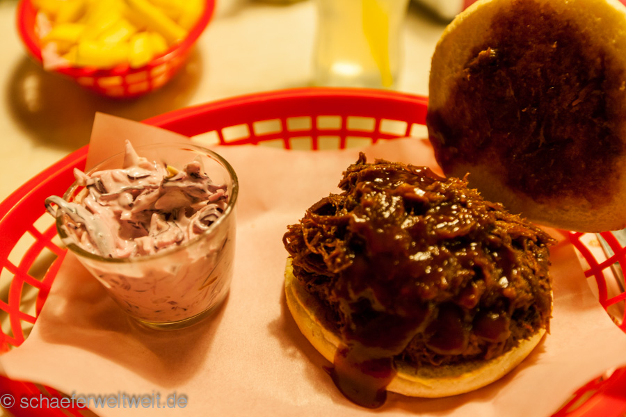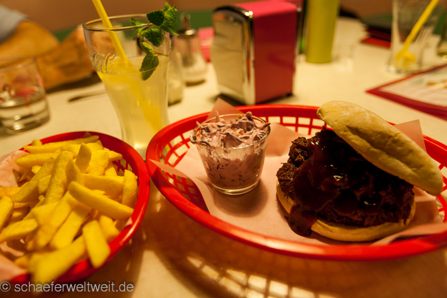 Von selbst gemachten Relishes und Saucen, über Hot Dogs und Burger, bis hin zu Spareribs und heißem Chili, wird hier einiges geboten was man sonst Selten findet. Spätestens beim BBQ Special „Homemade Pulled Pork Sandwich“ mit „Pink Cole Slaw“ oder dem „5 Dollar Shake“ (PulpFicion lässt grüßen), wird es auf jeden Fall sehr Speziell. Wem das alles nichts sagt – einfach vorbei gehen und geniesen! Aber bitte pünktlich sein, sonst heißt es „Bitte vor der Tür warten“! Die begehrten Plätze im Laden sind ziemlich schnell vergeben und wer dort mal gemütlich sitzt bleibt meist sitzen.