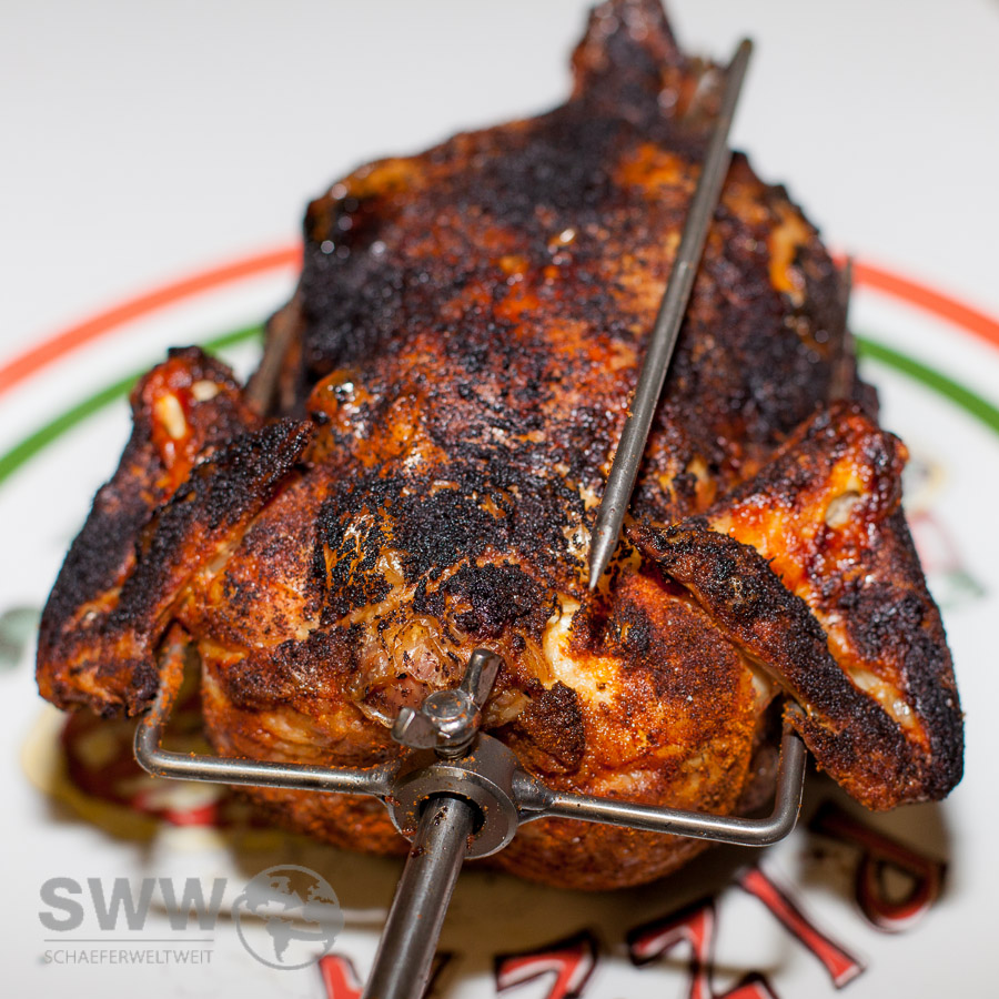 Technik kann durchaus auch mal faszinieren – selbst bei einem Grill. Daher zeige ich hier mal einen  „Turbinengrill“. Nach dem gleichen Prinzip der Kerzen einer „Weihnachtspyramide“ (link) treibt diesen Spießgrill die aufsteigende Wärme an. Die glühenden Kohlen erhitzen mit Strahlungswärme Indirekt das Grillgut und treiben durch aufsteigende Wärme dass mit dem Spieß verbundene Flügelrad an. Der Spießgrill lässt sich für alle möglichen Speißen verwenden, Huhn ist hier nur als eines der bekannteren Beispiele gezeigt.