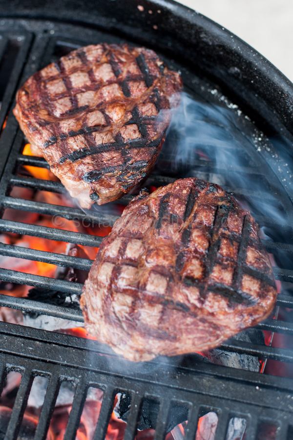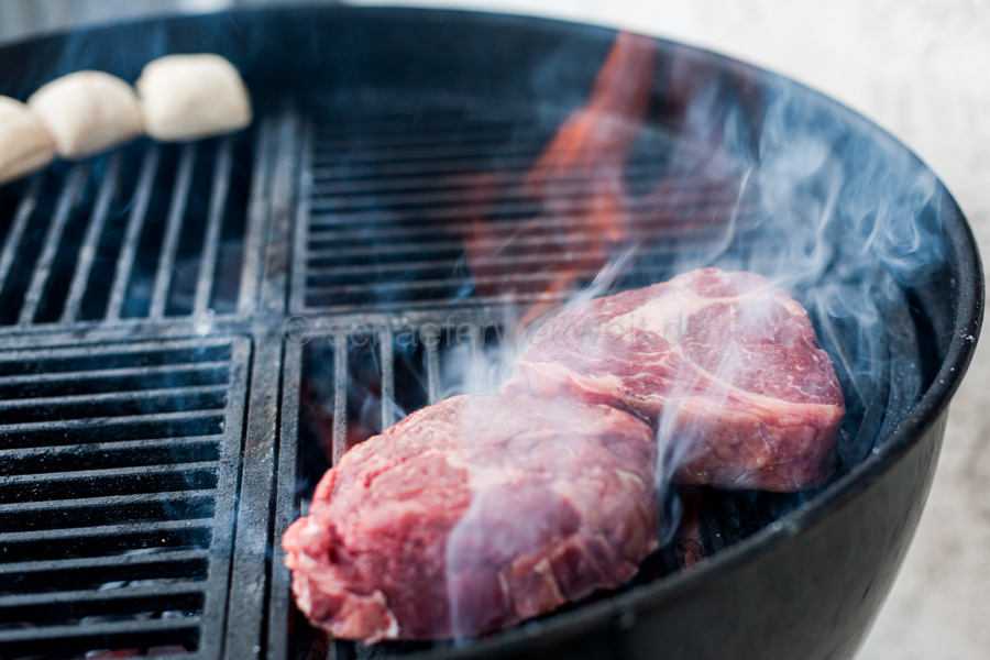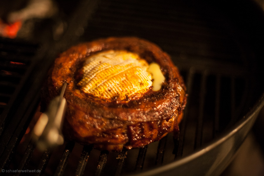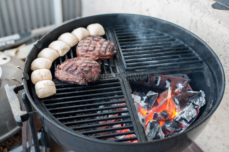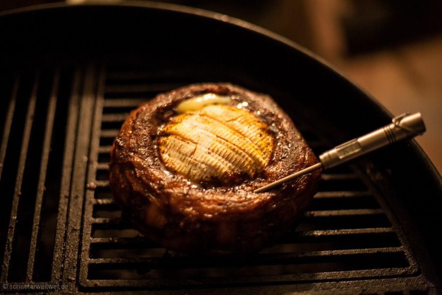 Steaks die mehr als 4 cm haben können nicht im Direkt-Grill-Verfahren gemacht werden. Diese müssen nach dem scharf anbraten in der indirekten Wärme weitergegart werden. Steaks = oder unter 3 cm sind fast immer viel zu schnell durch und trocken bevor das „Branding“ sprich die Röststoffe am Fleisch ausreichend gebildet werden können.