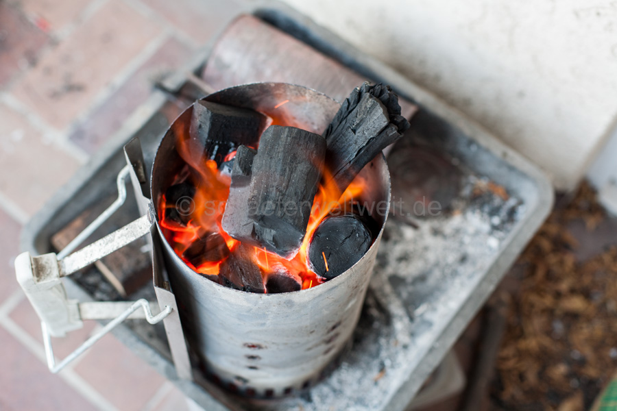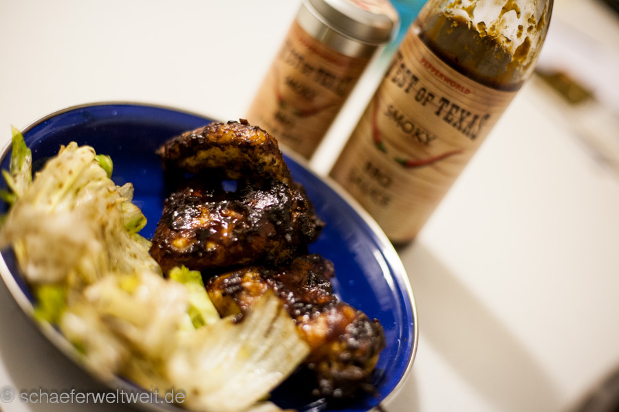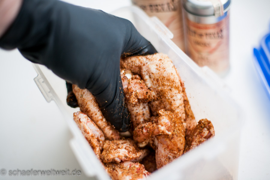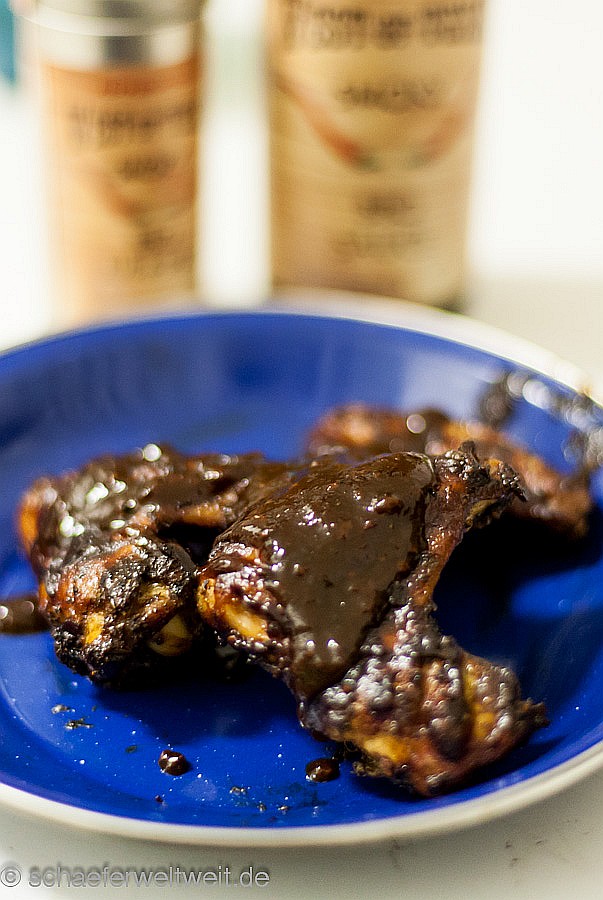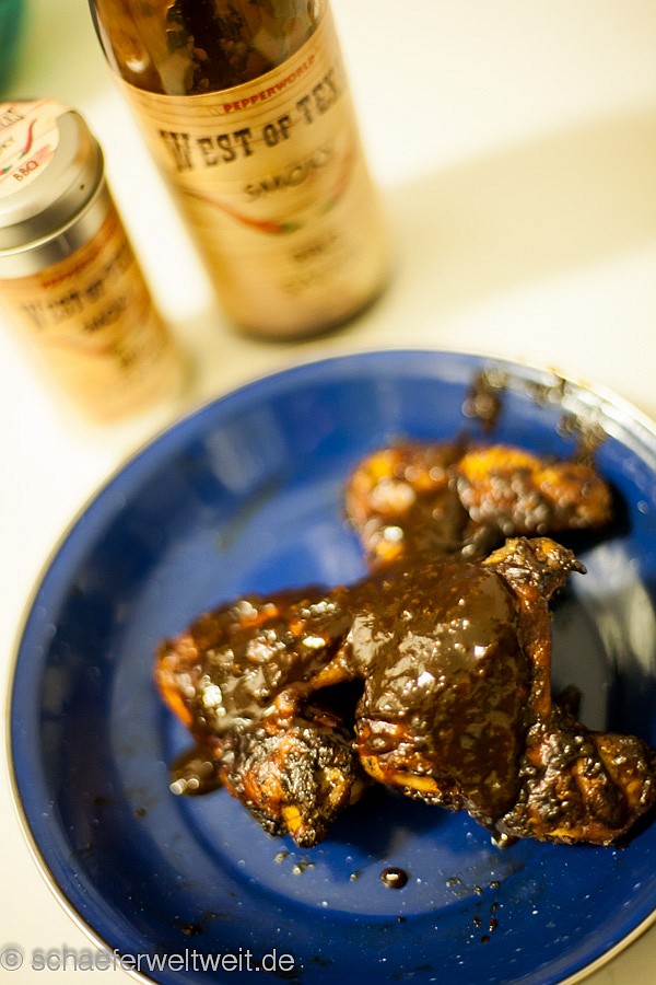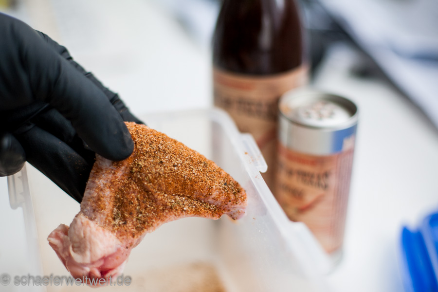 Auch ziemlich einfach wenn man weiß wie es geht. Hänchenflügel mit einer Würzmischung auf Zuckerbasis (Rub) einstreuen und das Rub einmassieren. Während dessen starten die Kohlen im Anzündkamin von selbst. Dann indirekt auf den Grill legen und ein bisschen Räucherholz auf die Glut werfen. Deckel zu auch die Lüftung oben geschlossen – die Luftzufuhr unten fast komplett geschlossen so das man um die 120 bis 140°C im Garraum hat. Nach 20 Minuten einmal wenden – nach 40 Minuten das erste Mal mit BBQ-Sauce von beiden Seiten großzügig einpinseln (moppen) – nach 50 Minuten noch einmal einpinseln – nach 60 Minuten noch einmal die untere und obere Luftzufuhr ganz öffnen und nochmal gut aufheizen. Ca. 80 Minuten nach dem auflegen sollten sie fertig sein. Wenn man die Wings ohne spürbaren Widerstand ablutschen kann ist es genau richtig.