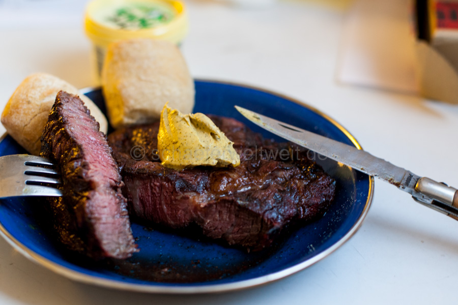 Wichtig ist ein gutes Fleisch zu nutzen und das fängt mit dem guten Metzger an. Dabei kann man, meiner Ansicht nach, auch unbedingt auf heimische Herkunft achten. Ein gutes Steak muß nicht um die halbe Welt gereist sein. Das Fettauge sollte ausgeprägt und das Fleisch gut marmoriert sein. Der Schnitt ist auch wichtig – ca. 4 Zentimeter (ca. 400g) sollten es schon sein. Das Steak wird vor dem Grillen nicht mariniert oder irgendwie behandelt, aber es sollte vorher bei Zimmertemperatur warm werden. Der Grill sollte idealerweise einen schweren Gusseisenrost besitzen. Diese dünnen Metallgitter speichern einfach nicht genug Hitze den Anfangs muß es schnell gehen da sonst der Fleischsaft ausläuft. (Evtl. sollte man ein zusätzliches kleines Gusseisenrost, einzeln nur für den Zweck dazu kaufen und dann einfach auf den normalen Rost legen) Den Grill nun so heiß wie möglich machen (viel durchgeglühte Kohle in kurzem Abstand unter dem Rost) Nun das Steak auflegen und genau 2 mal drehen und einmal wenden (Grillzange! Fleisch nie anstechen). 1,5 min. auflegen dann einmal um 90 Grad drehen – nach 1,5 min. wenden und nach weiteren 1,5 min. nochmal um 90° drehen und nach 1,5 min. ist es fertig (blutig/rare) Diese Zeiten sind aber immer jetzt nur eine grobe Hilfe für den Anfang mehr nicht. Das hängt sehr von der Fleischqualität und dem Schnitt – genauso der Grill-Temperatur und der Grillrost-Art ab. (Besser ist der Handballen-Test weiter unten) Danach wird das Steak ruhen gelassen. Dazu ein/zwei Minuten in Alufolie einpacken. Danach nur etwas grobes Salz und Pfeffer mehr nicht. Guten Appetit.