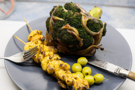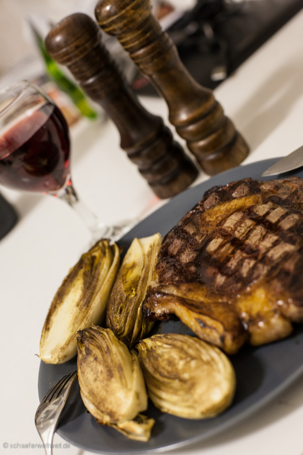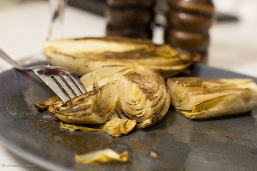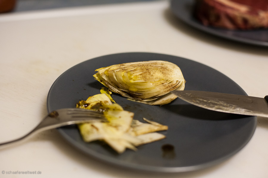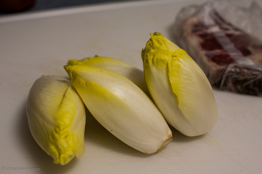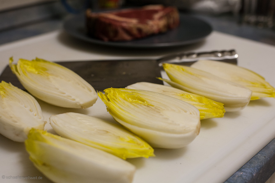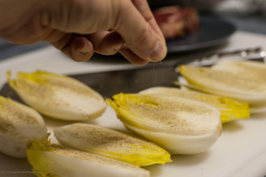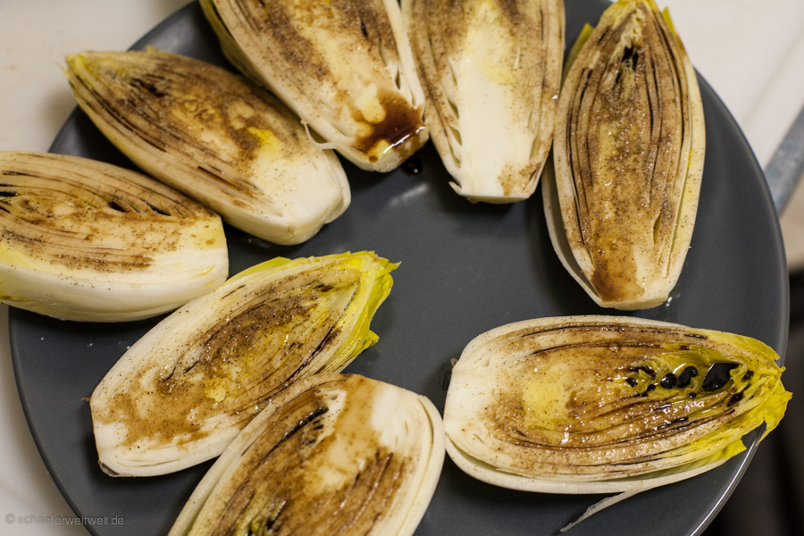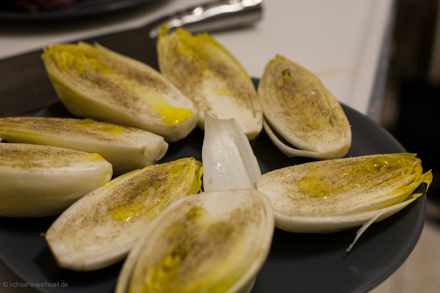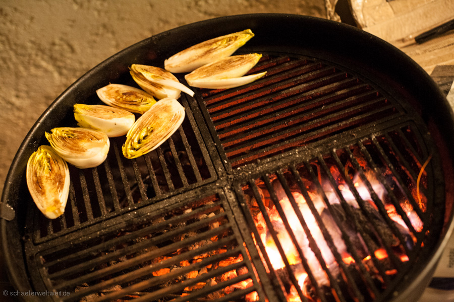 Ziemlich einfache Angelegenheit – Chicorée halbieren – Salz Pfeffer Olivenöl Balsamico – Indirekt ca. 20 Minuten nebenbei mit grillen – fertig.