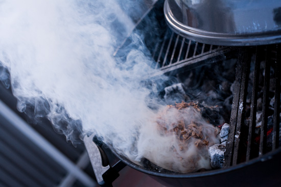 ( Bei 120 Grad ca. 40 Minuten, ein bis zweimal geräuchert, mit einer Hand voll gewässerter Holzspäne )