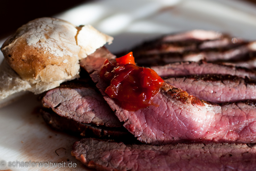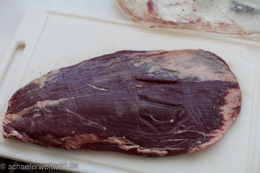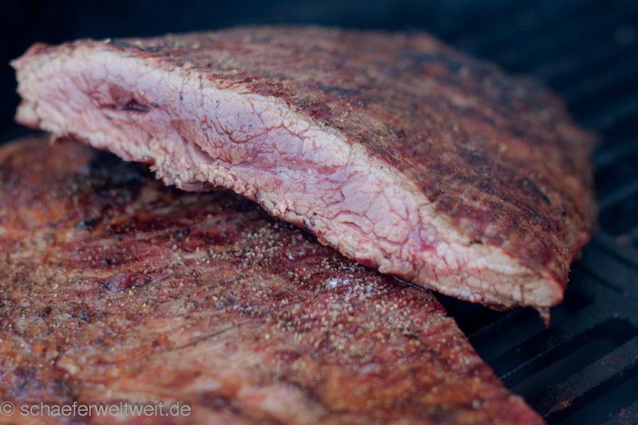 „Flank steak“ nennt man in der deutschen Küche soweit ich weiß „Bavette“ oder „Dünnung“. Es kommt aus dem unteren Rippenbereich, dem “Rinderlappen” unterhalb des Filets. Das Flank Steak eignet sich zum Kurzbraten / grillen und wird dann je nach Geschmack auf den Punkt gegart und quer zur Faser geschnitten. Beim Garpunkt richtet man sich nach den gängigen Kerntemperaturen (KT) für Steaks. Auf dem Hochgeheizten Grillrost wird das Steak von beiden Seiten angebraten und dann indirekt gelegt bis die gewünschte KT erreicht ist. (Tranditionell mariniert man wohl das Flank oft auch – ich bevorzuge es aber nur mit Salz und Pfeffer)