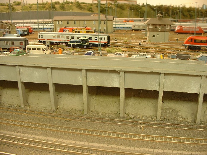 Unten: Ansicht des Stellwerk 9 und den S-Turm. Im unteren Teil sind die Gleise von und nach Bad Cannstatt zu erkennen. Das Stellwerk entstand im oberen Teil aus eingeritzten Computeretiketten die mit wasserverdünnten Plakafarbe überzogen wurden um eine Holzimitation hervorzurufen.