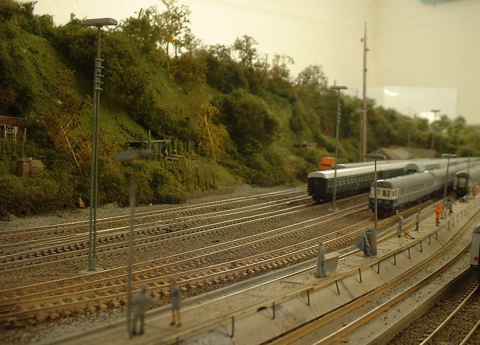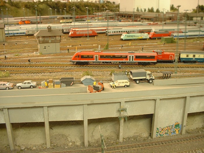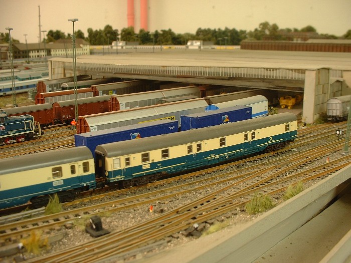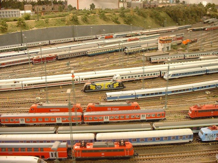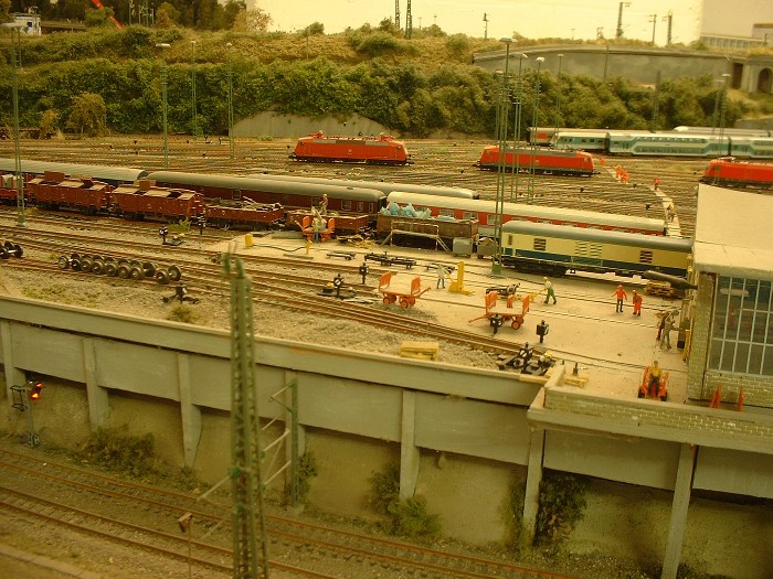 Unten: In der "N-Gruppe" gibt es die Gleise "646,647" die der Innenreinigung der Wagen vorbehalten sind. Das Schrubberteam wartet auf eine neue Möglichkeit ihr Können unter Beweis zu stellen. Links davon werden Bohnen gezüchtet. Aus diesem Grunde wurden die Gleise auch in einem Trog erbaut um das Grundwasser nicht zu verschmutzen. ( Ein Klageverfahren seitens der Kleingärtner wollte die DB offensichtlich nicht eingehen )
