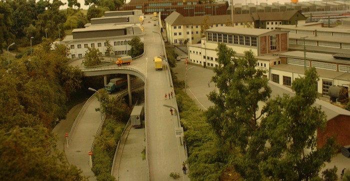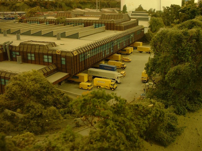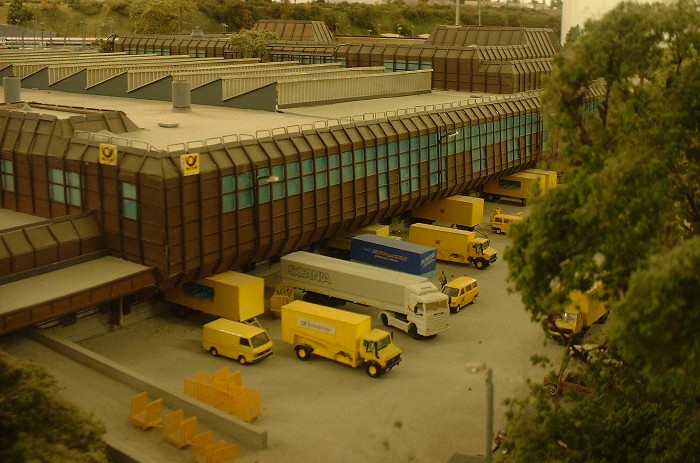 Unten: Die Strassenseite des Paketpostamtes. Das Modell entstand aus Spiegelglas, Polystyrolstreifen, DcFix, blauen durchsichtigen Aktenordnern und viel Liebe zum Detail. Auch viele Fahrzeuge entstanden im Eigenbau.